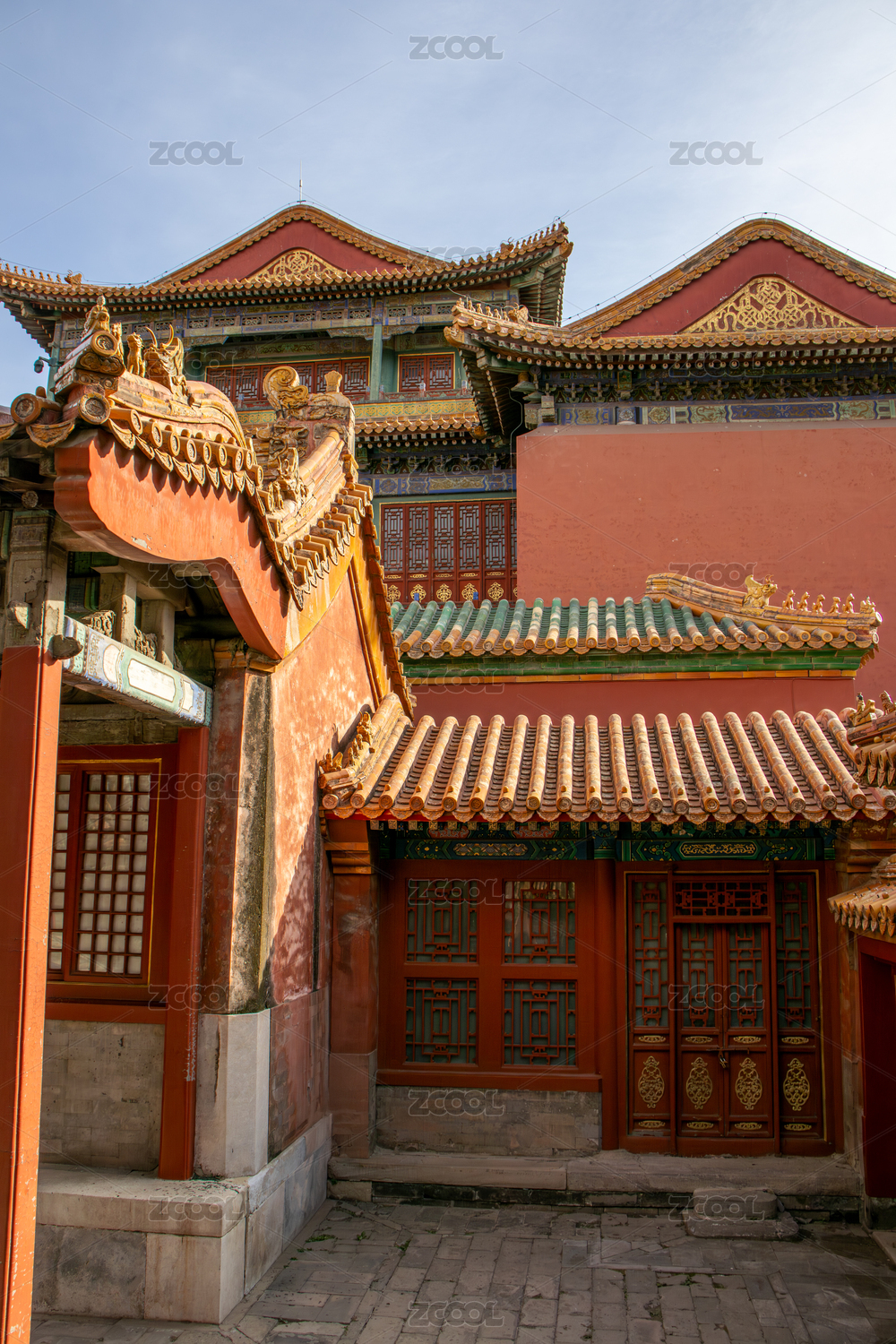 北京故宫宫殿古建筑红墙黄色屋檐局部特写