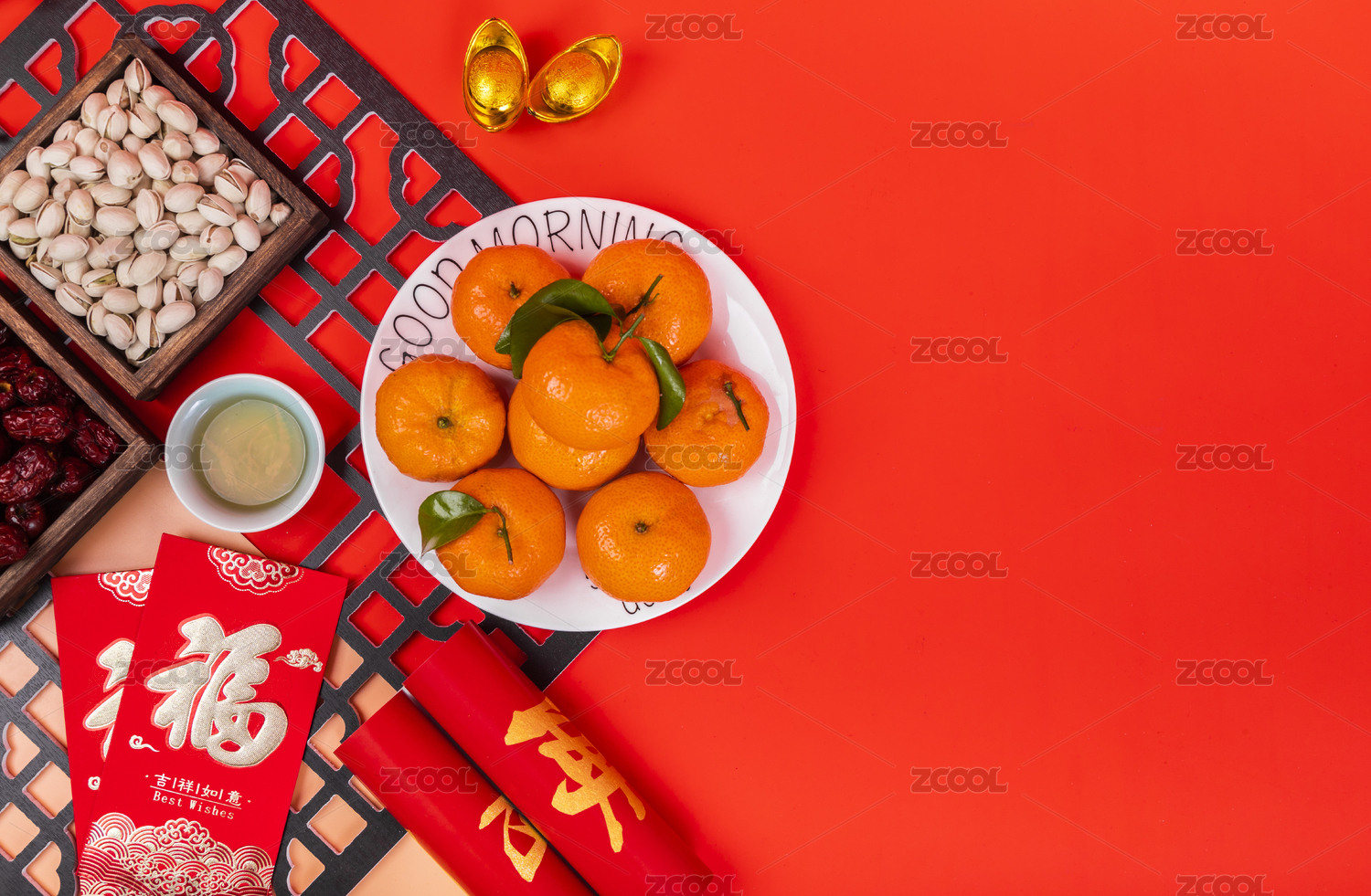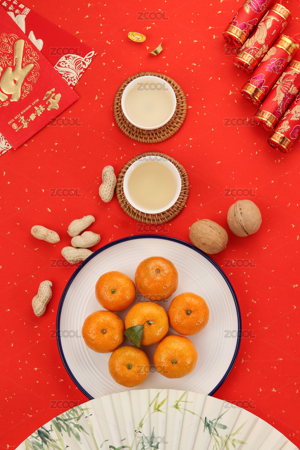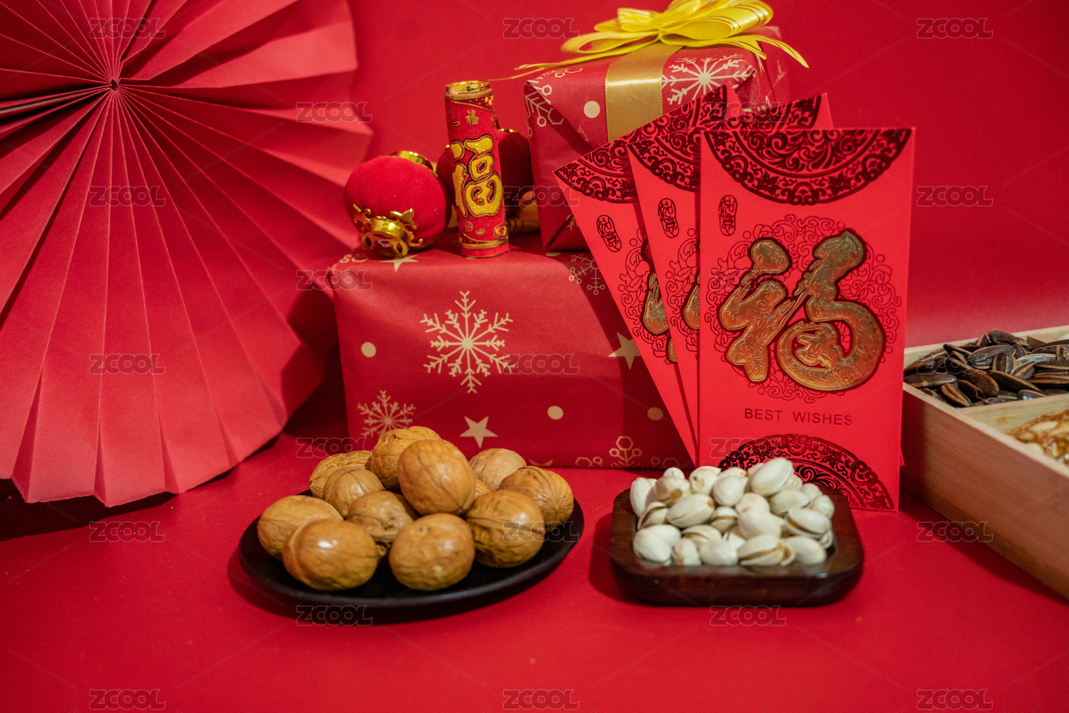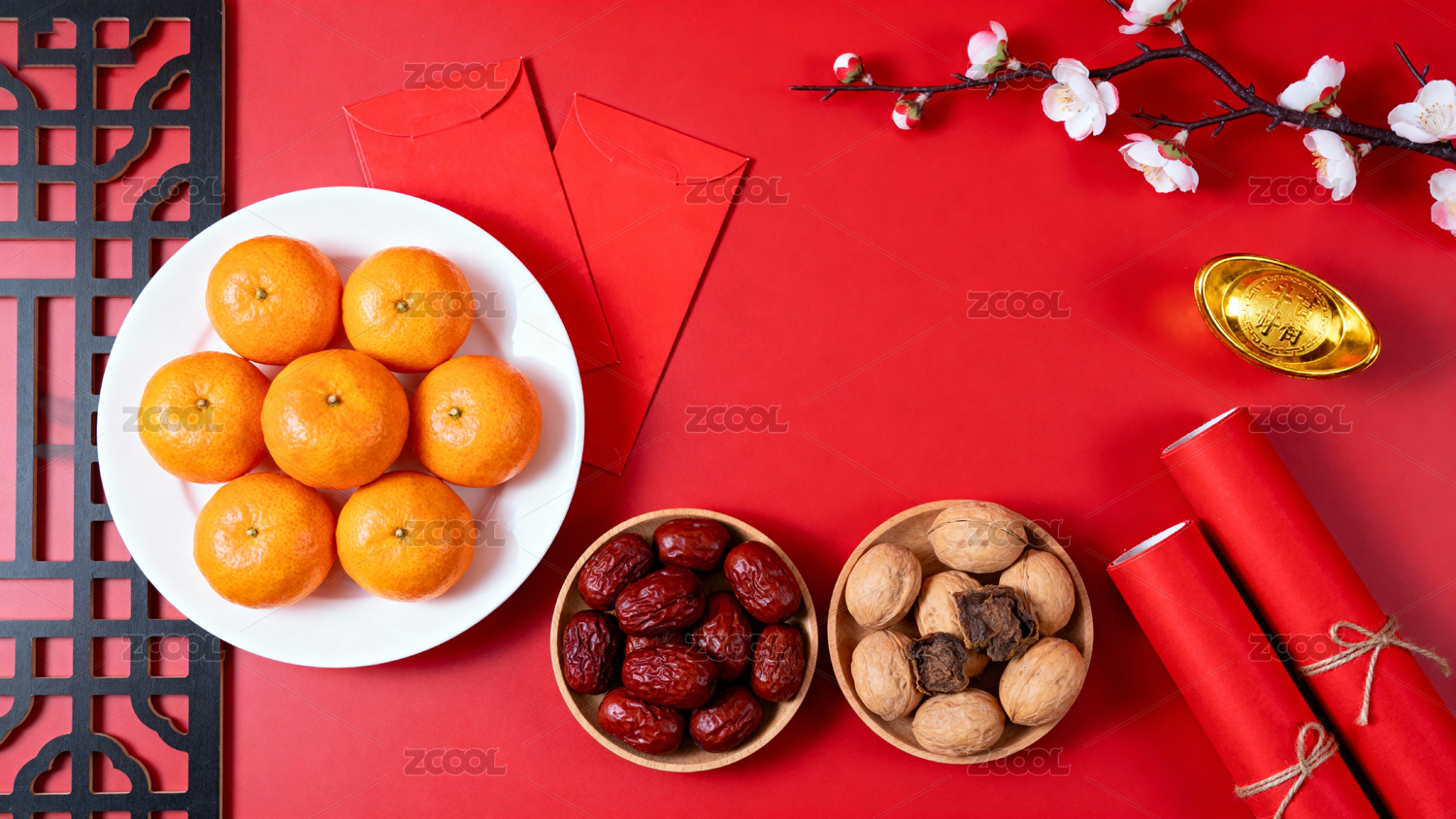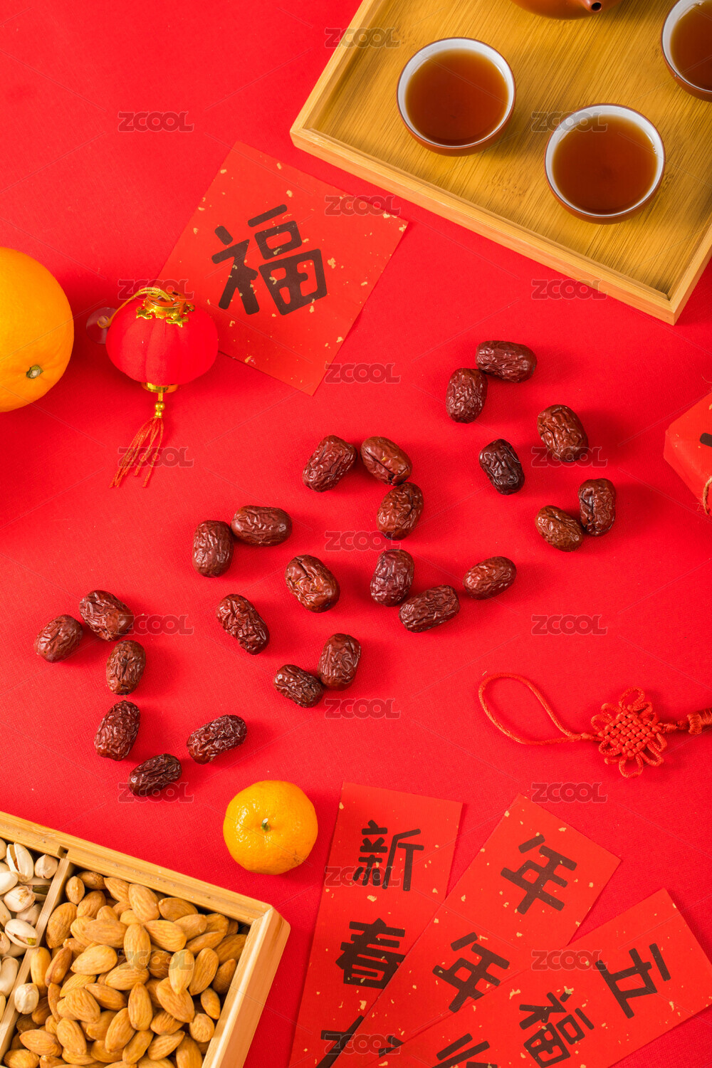 用红枣摆的2020放在红色背景上旁边还有对联及果盘