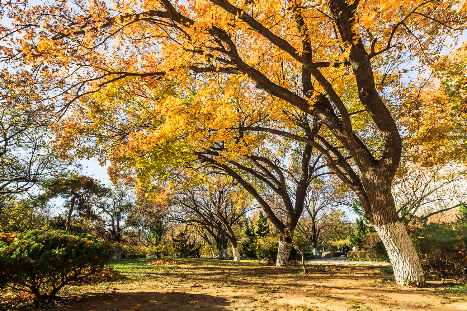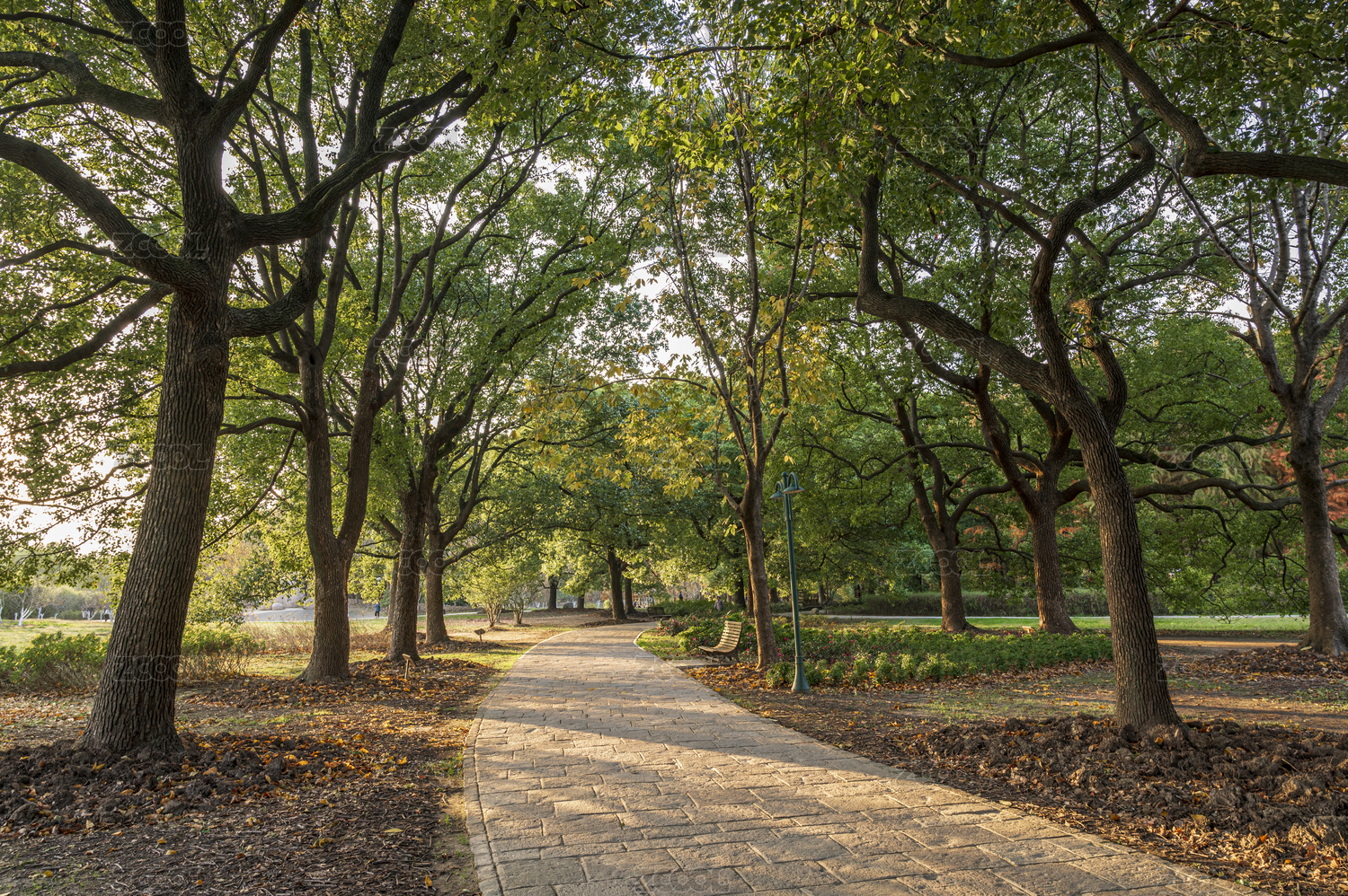 北京奥林匹克森林公园林荫道上的阳光漫步