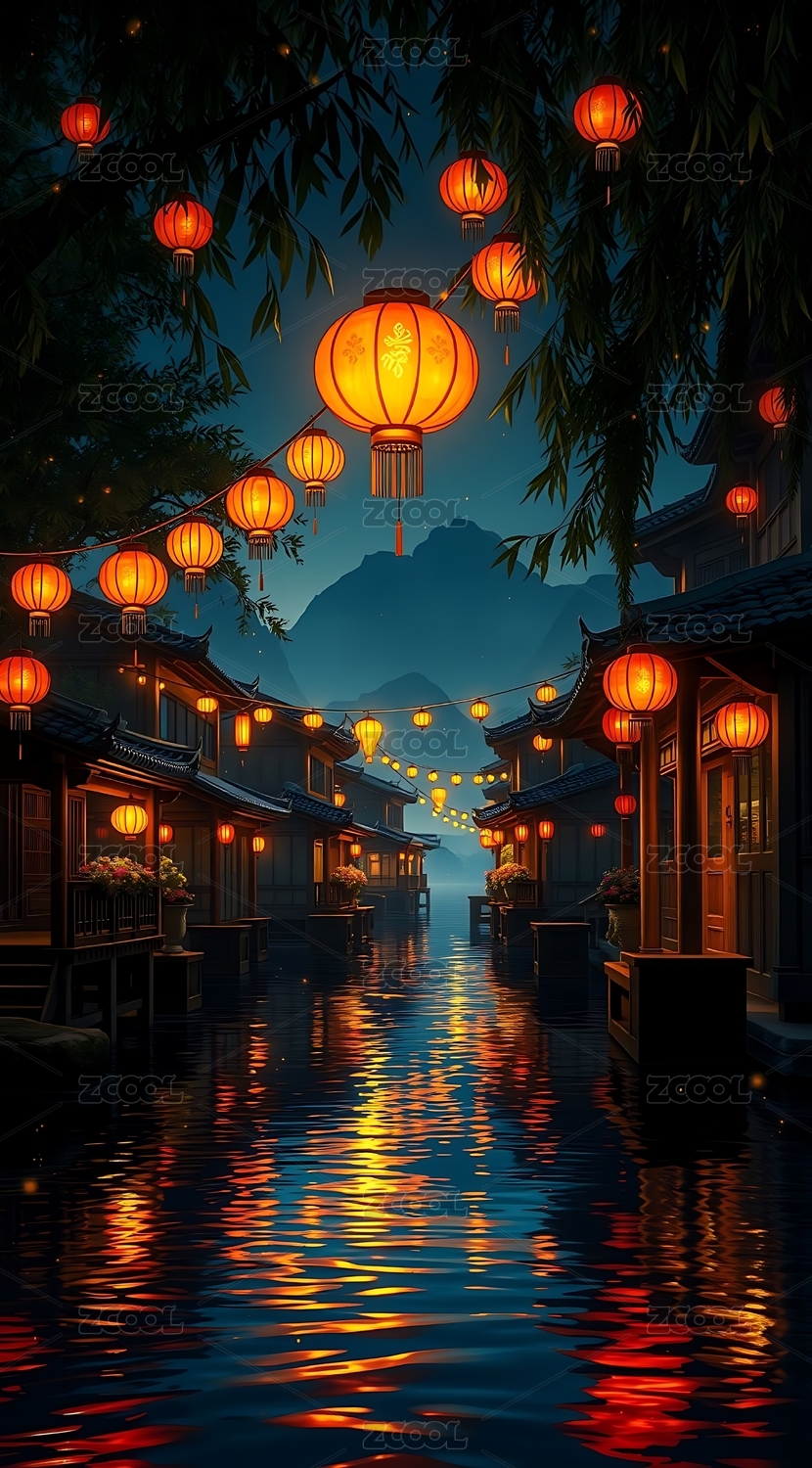 夜幕下的古街灯笼映照水乡情