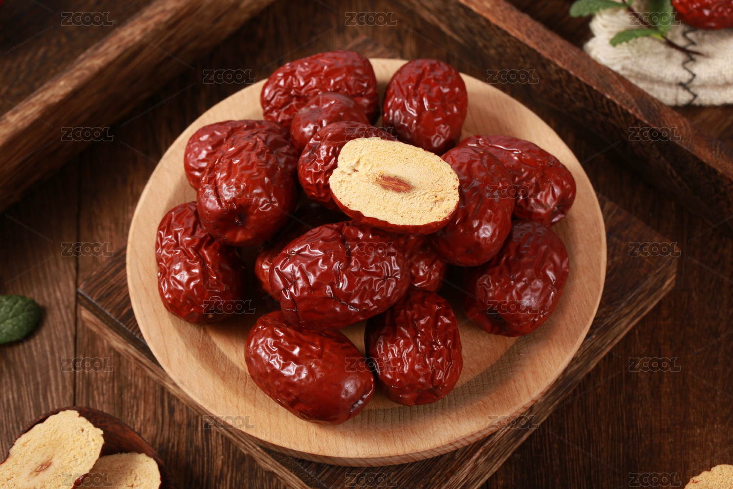 中国风场景里木盘子上装着红枣
