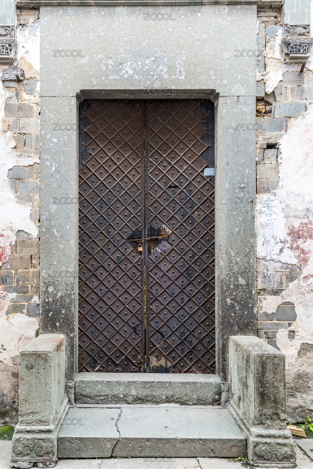 绿色植物在安徽,中国的古村落传统房屋的木门。