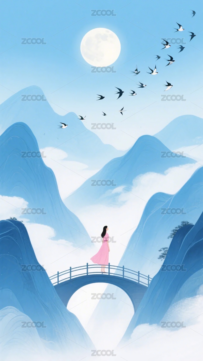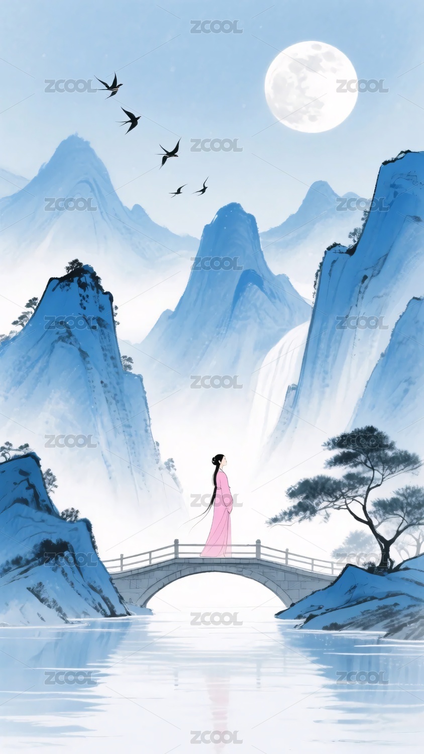 女子立于月夜山水间的桥