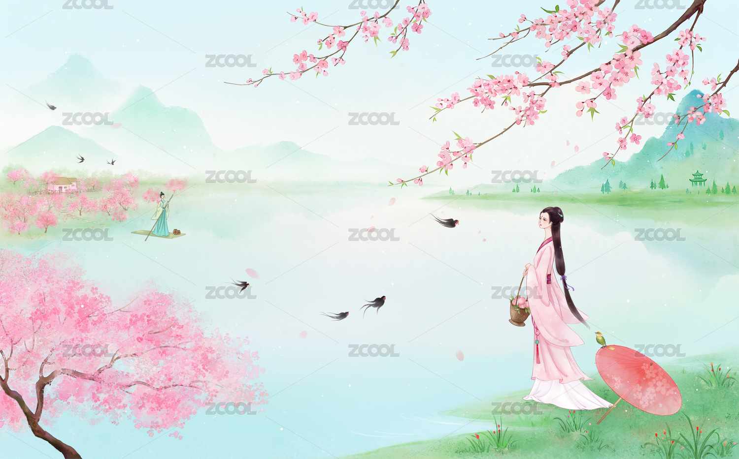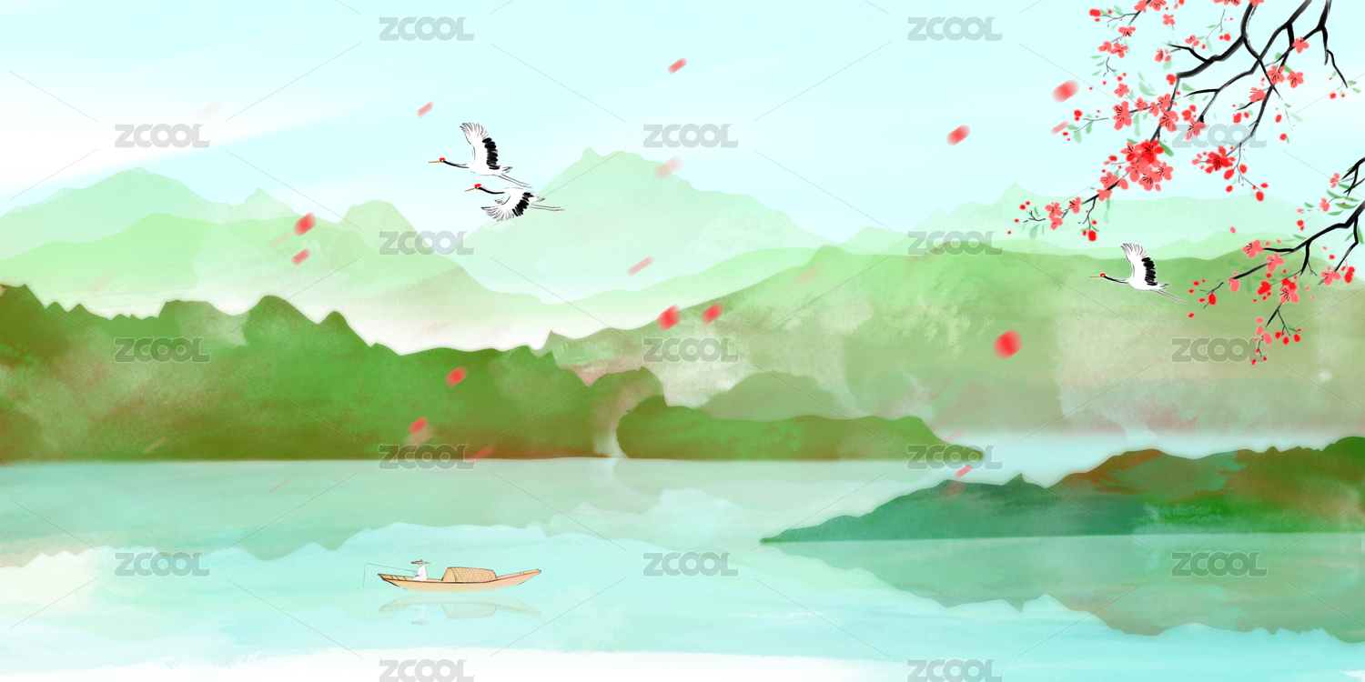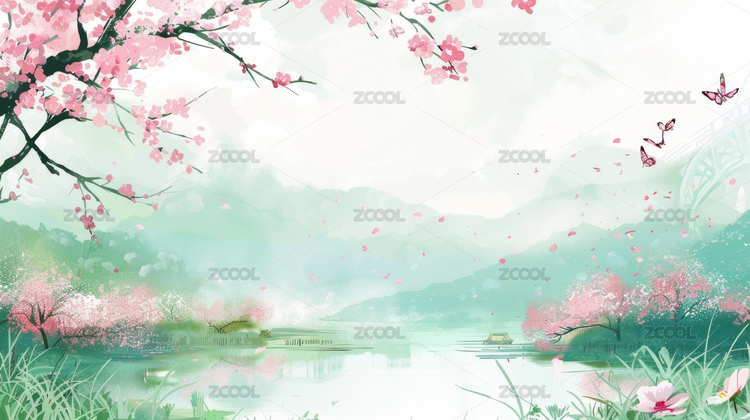 水墨画二十四节气山水风景画桃花盛开小船湖