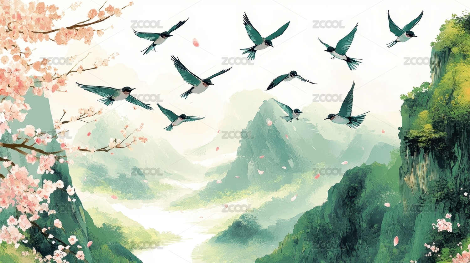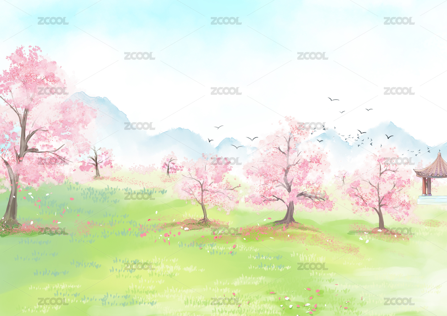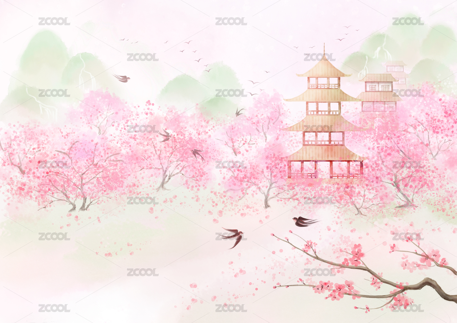 水墨画二十四节气山水风景画桃花盛开小船湖
