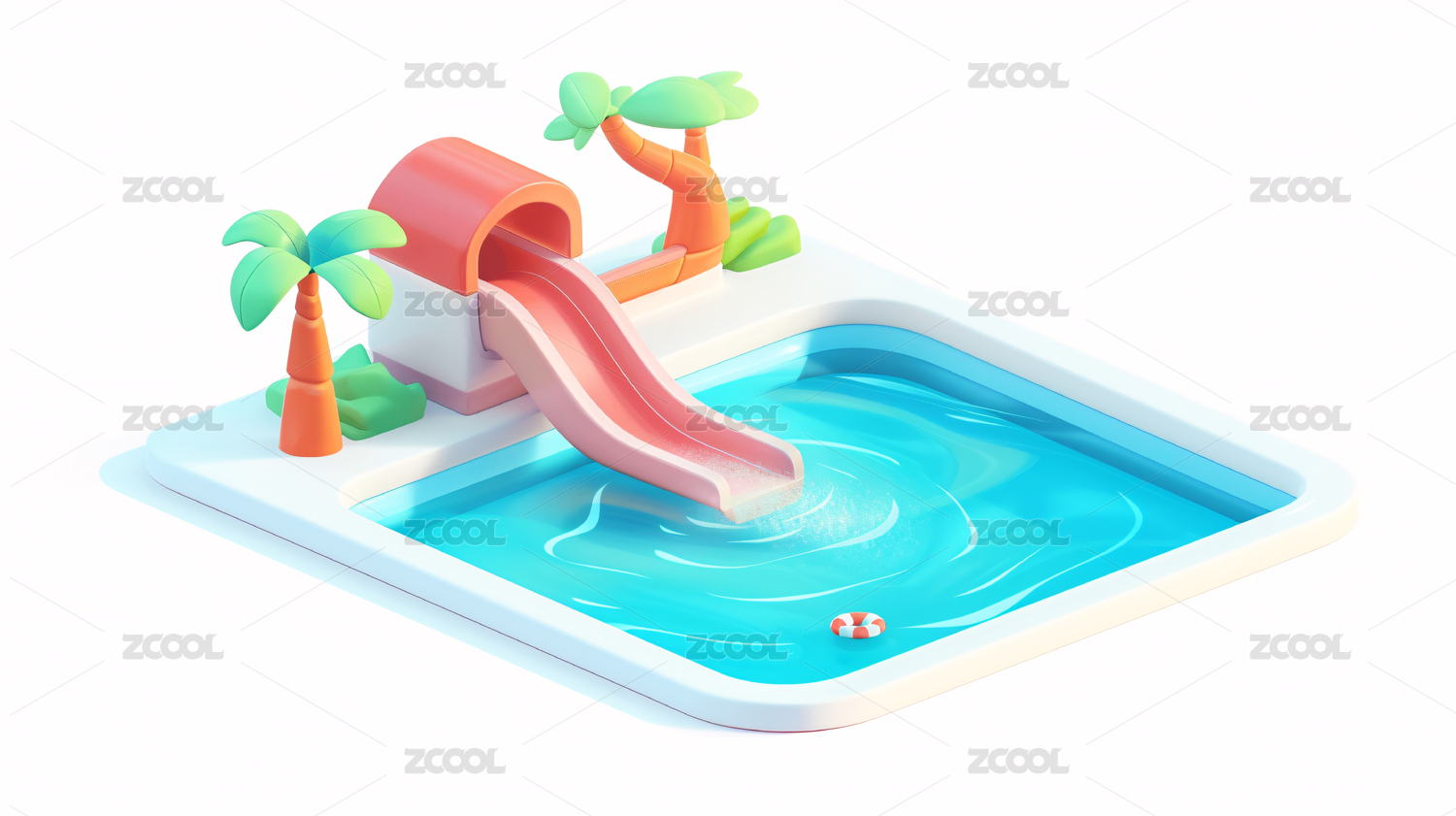 儿童水上乐园夏天游泳池避暑冲浪3D插画