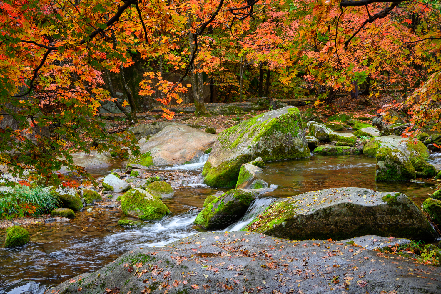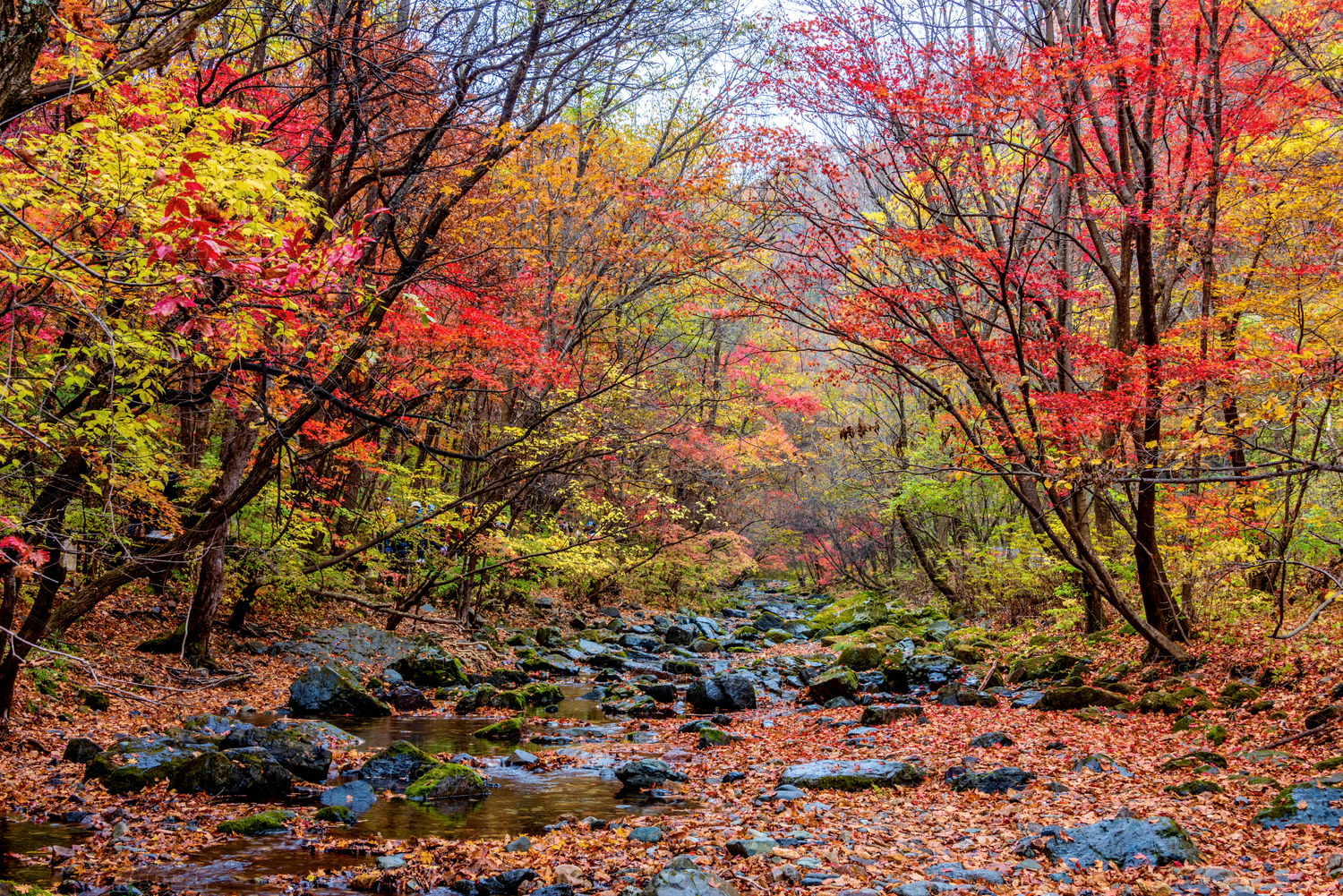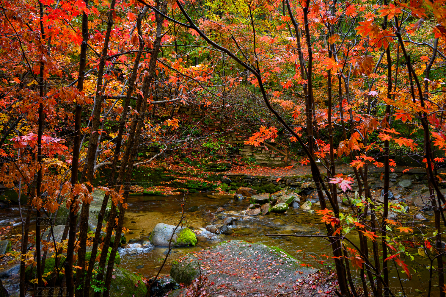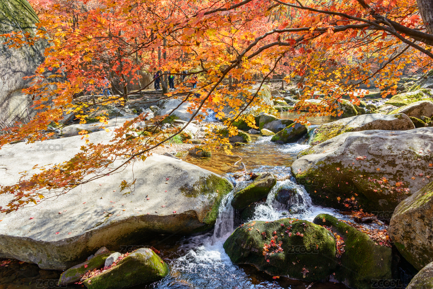 沈阳本溪老边沟,秋季枫树红叶溪流自然风光