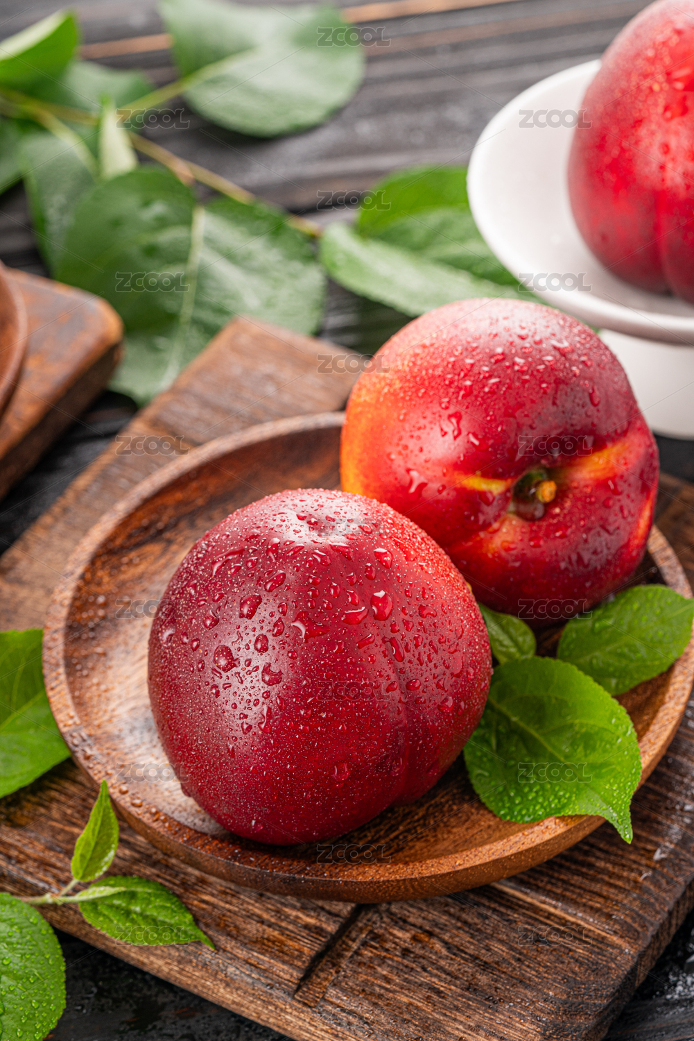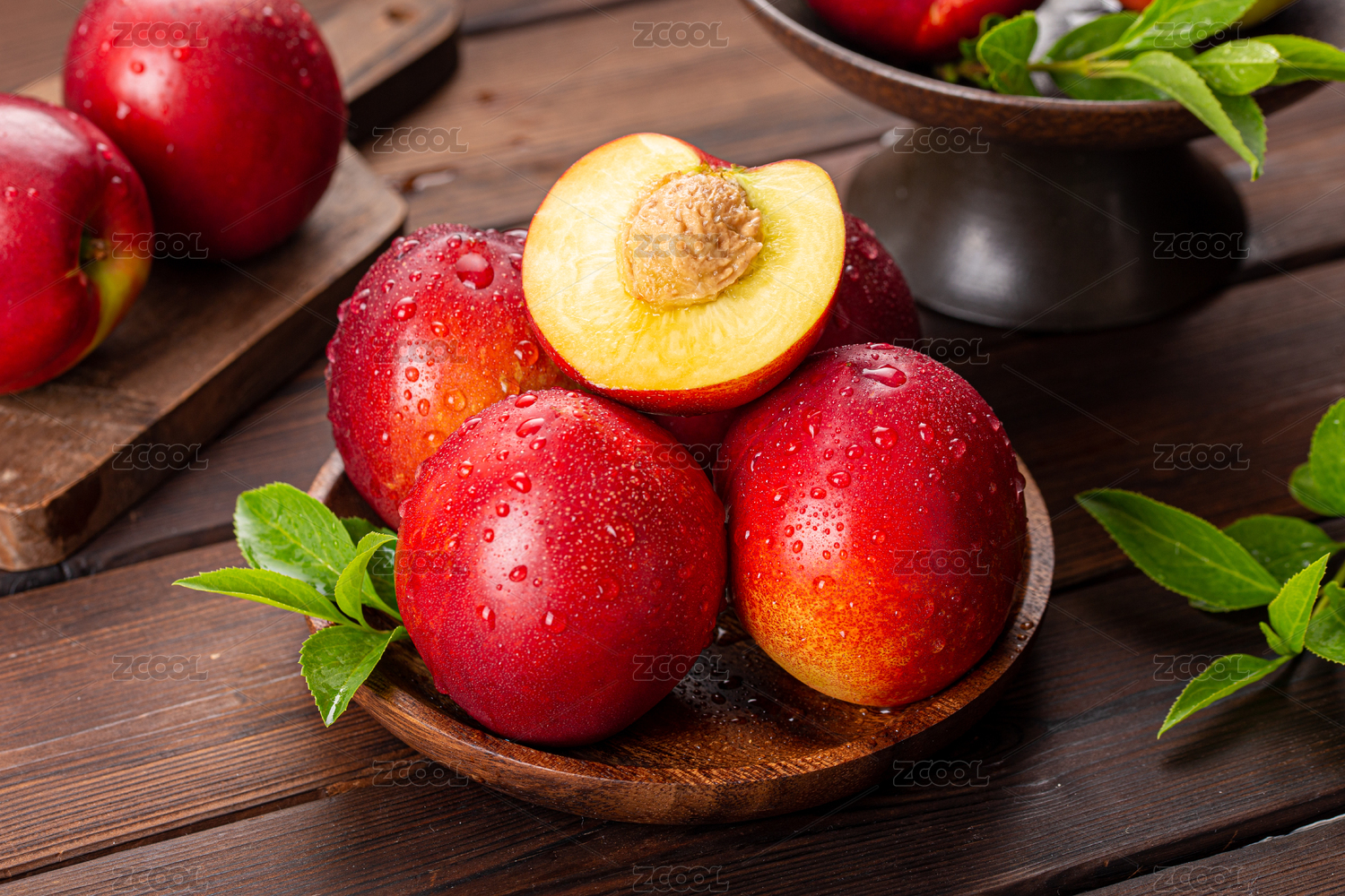 木底上放着新鲜黄心油桃和油桃果肉