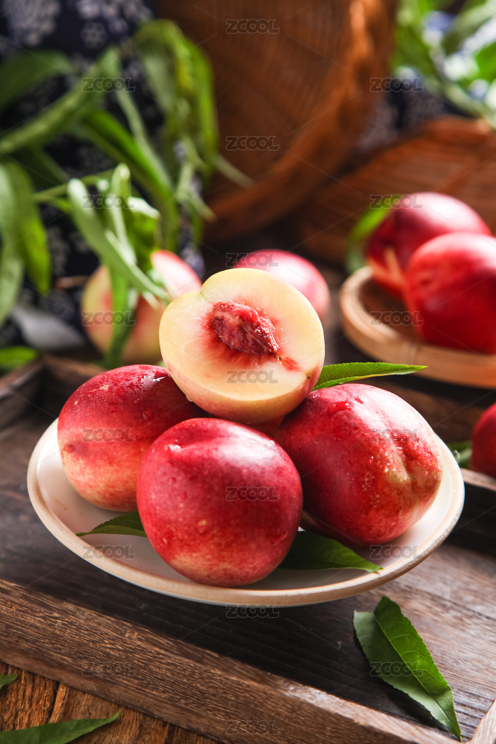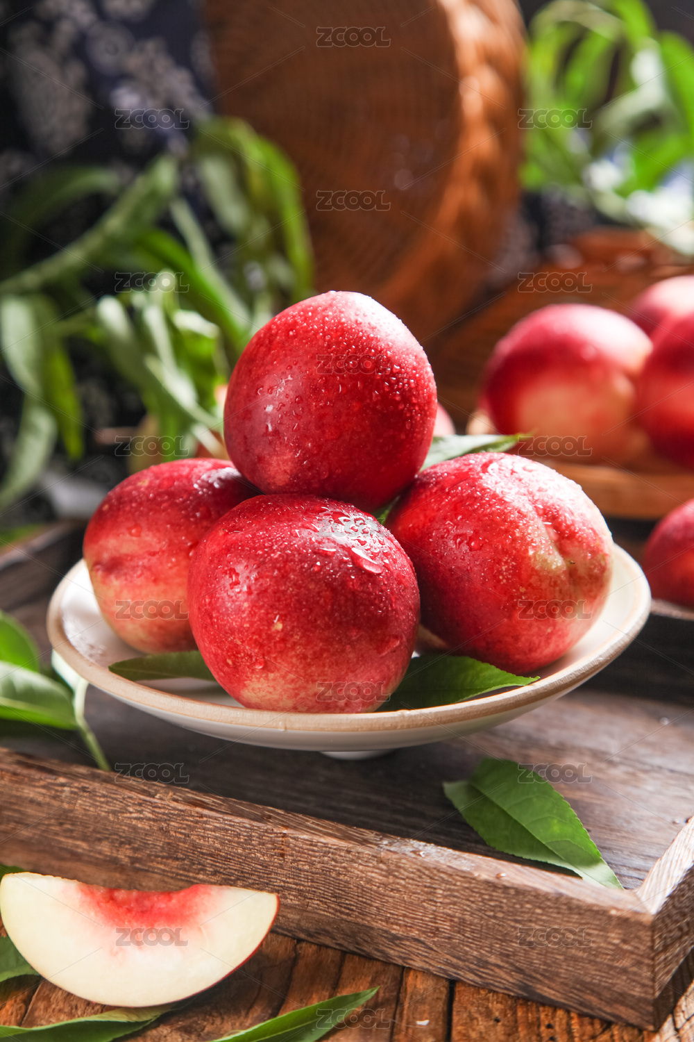 木底上放着一盘油桃