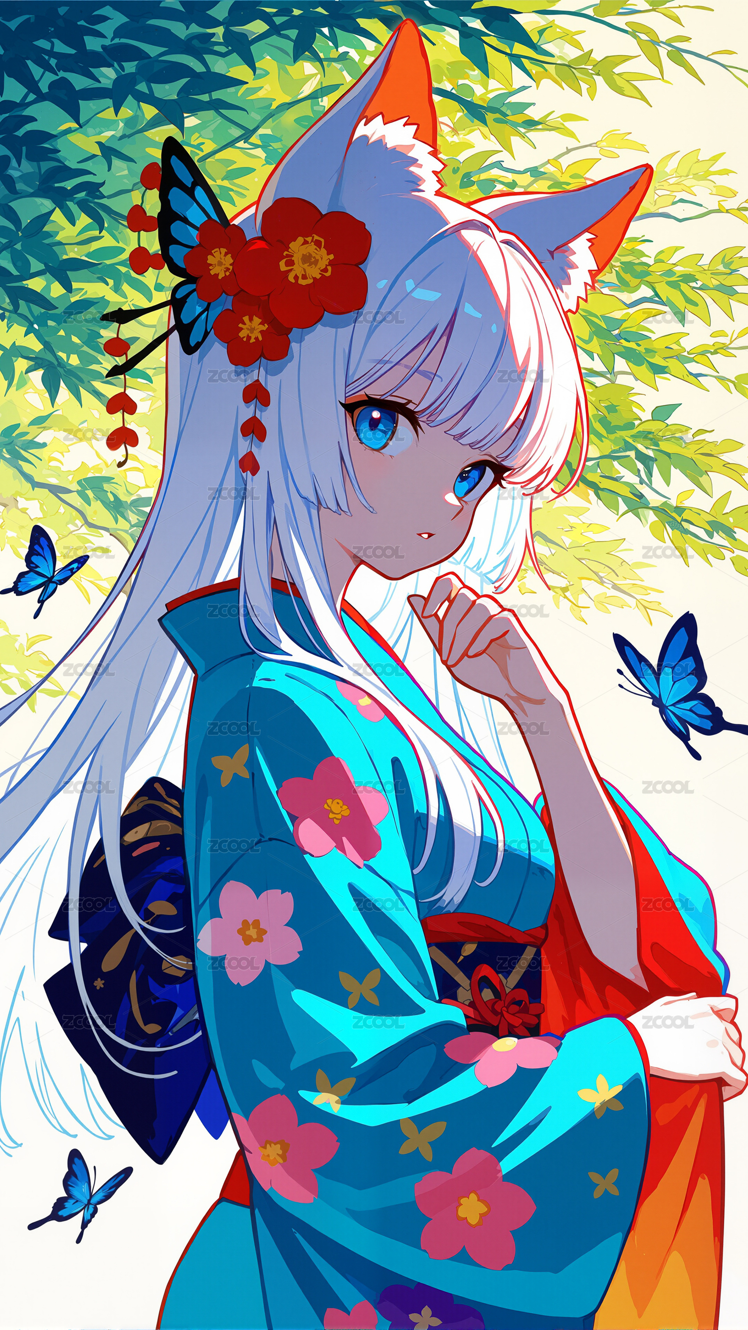 绿叶间的蓝蝶少女