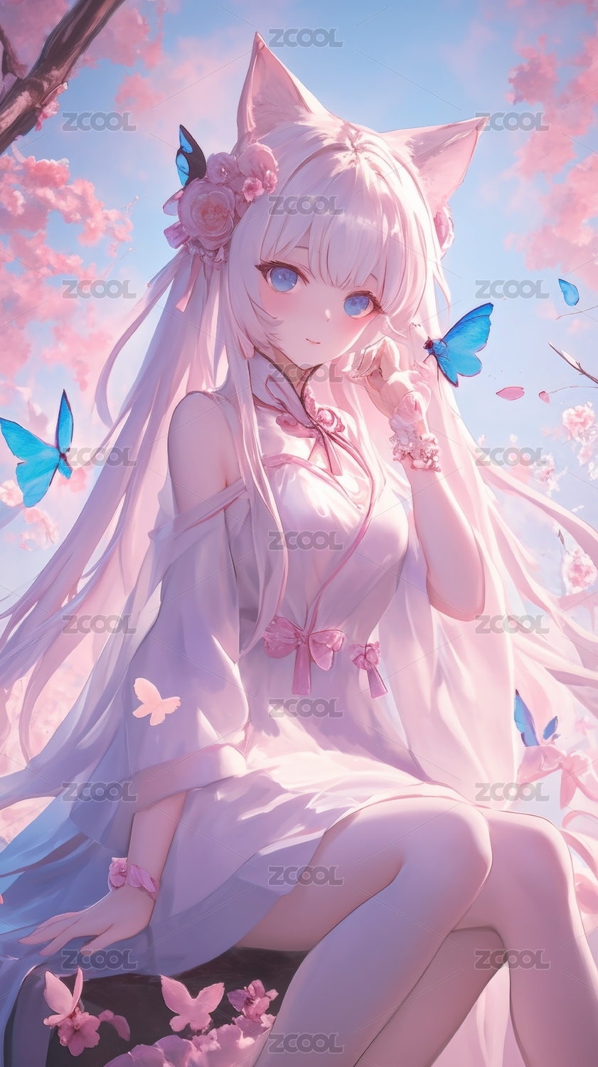 猫耳少女在樱花树下的梦幻场景