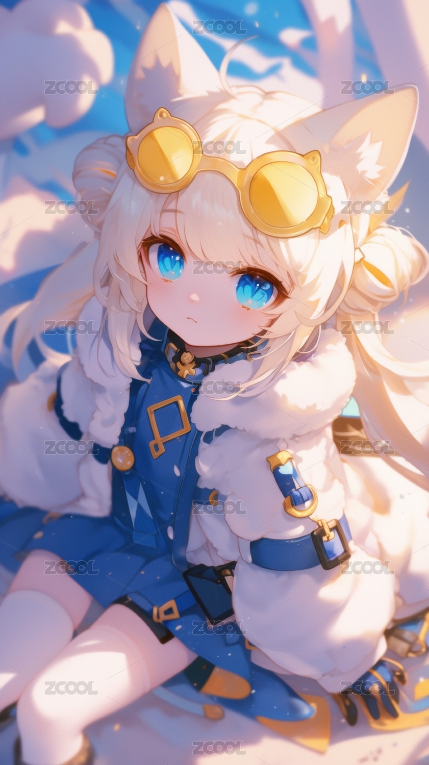 金发少女身着蓝白服饰佩戴护目镜