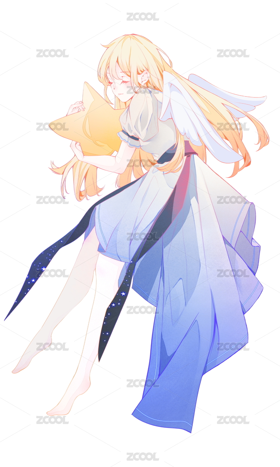 长着白色翅膀的女孩抱着星星沉睡
