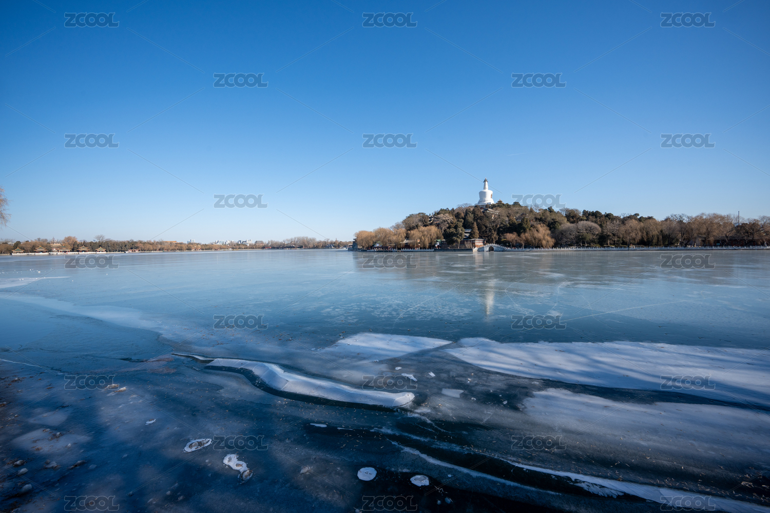 冬天中国沈阳北陵公园冰雪覆盖的湖面