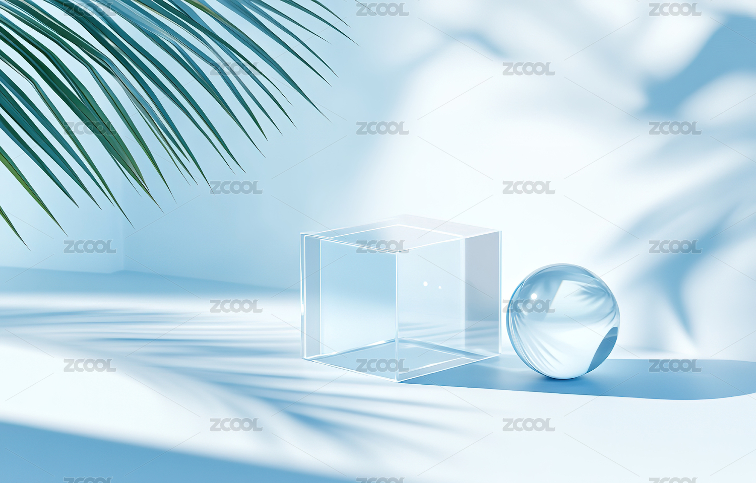 展示台,DXCZ202401,简洁,球体,两个,蓝色,背景,棕榈,叶子,立方体