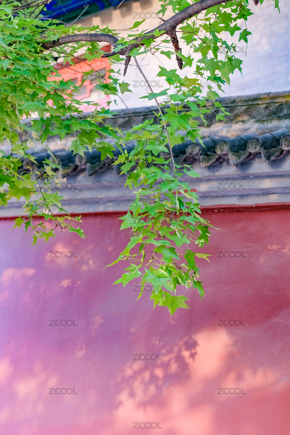 北京故宫博物院红墙绿瓦和前景的绿色树叶