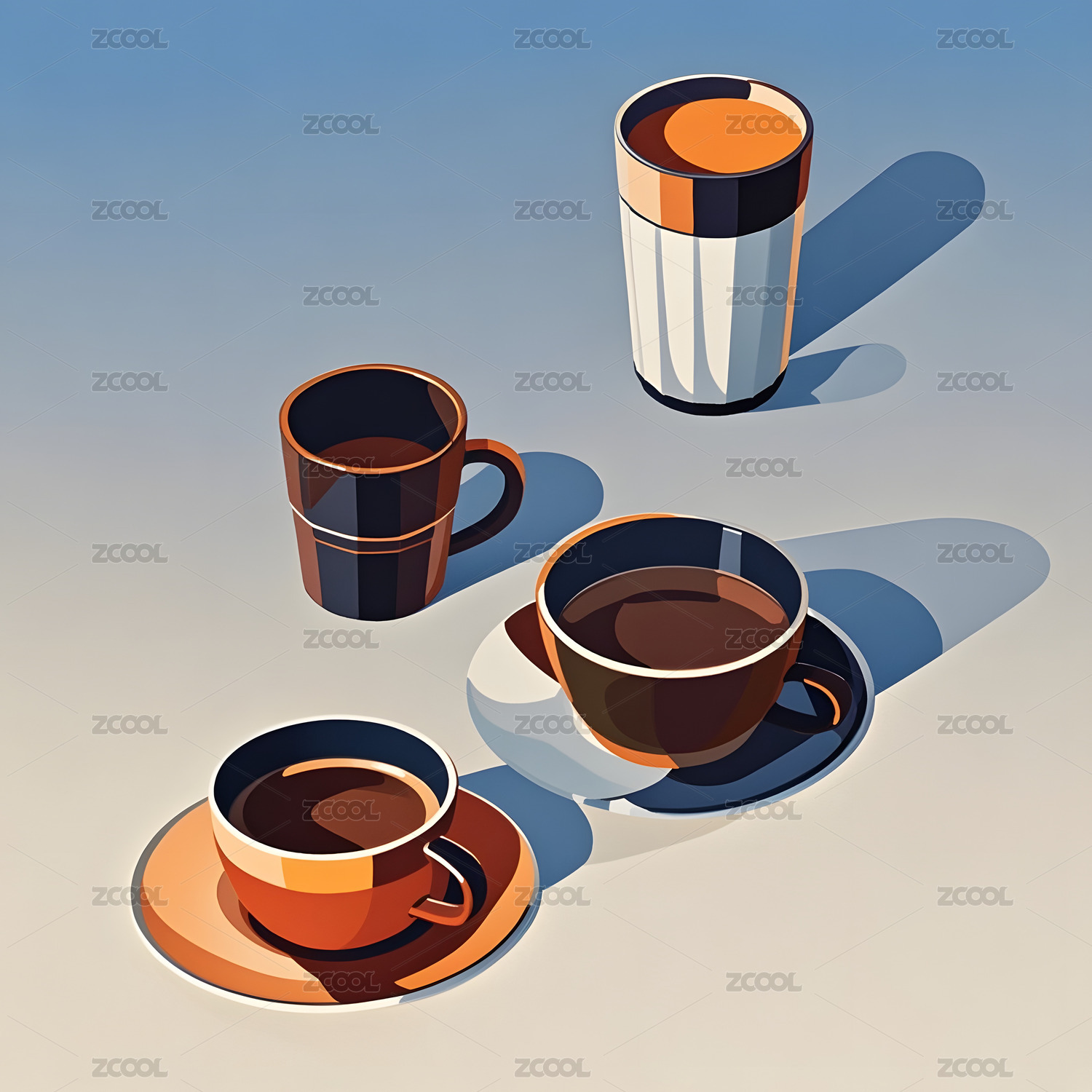 三杯咖啡,分别放在黄色杯子、红色杯子和蓝色杯子中 手绘插画
