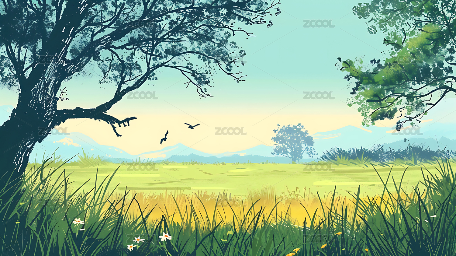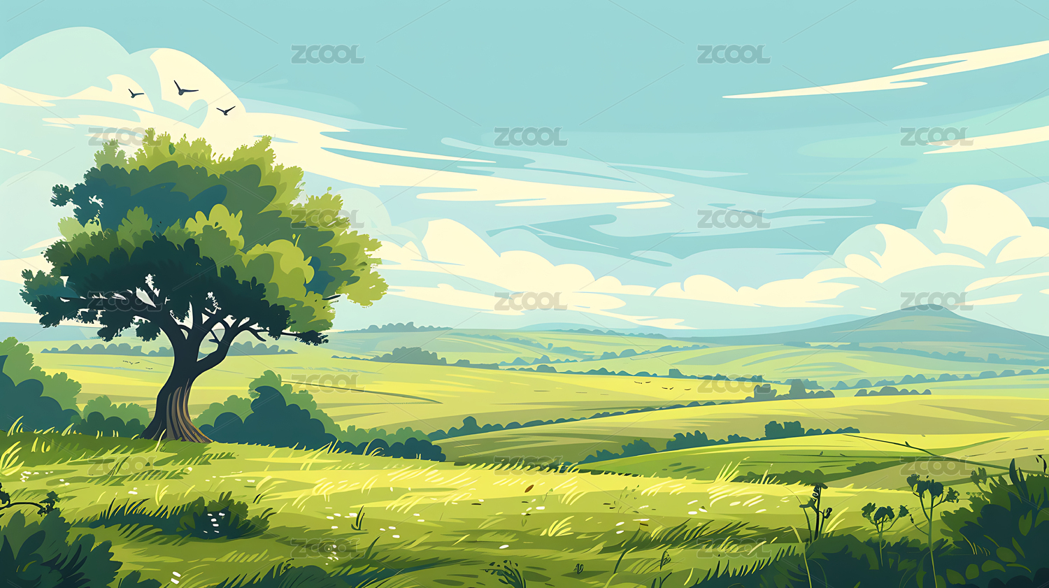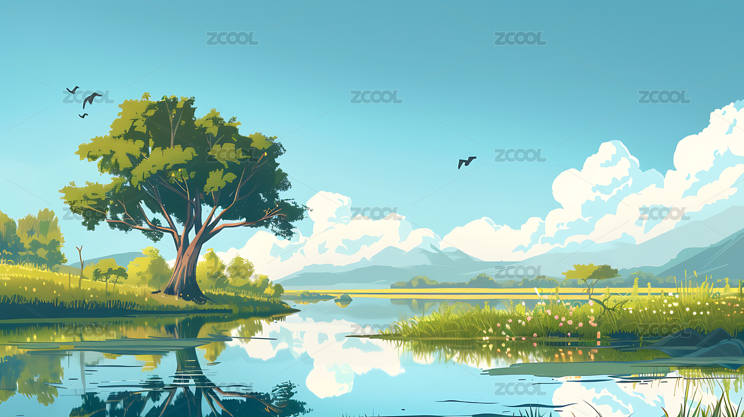 蓝天白云绿色草地湖泊卡通动漫背景插画壁纸