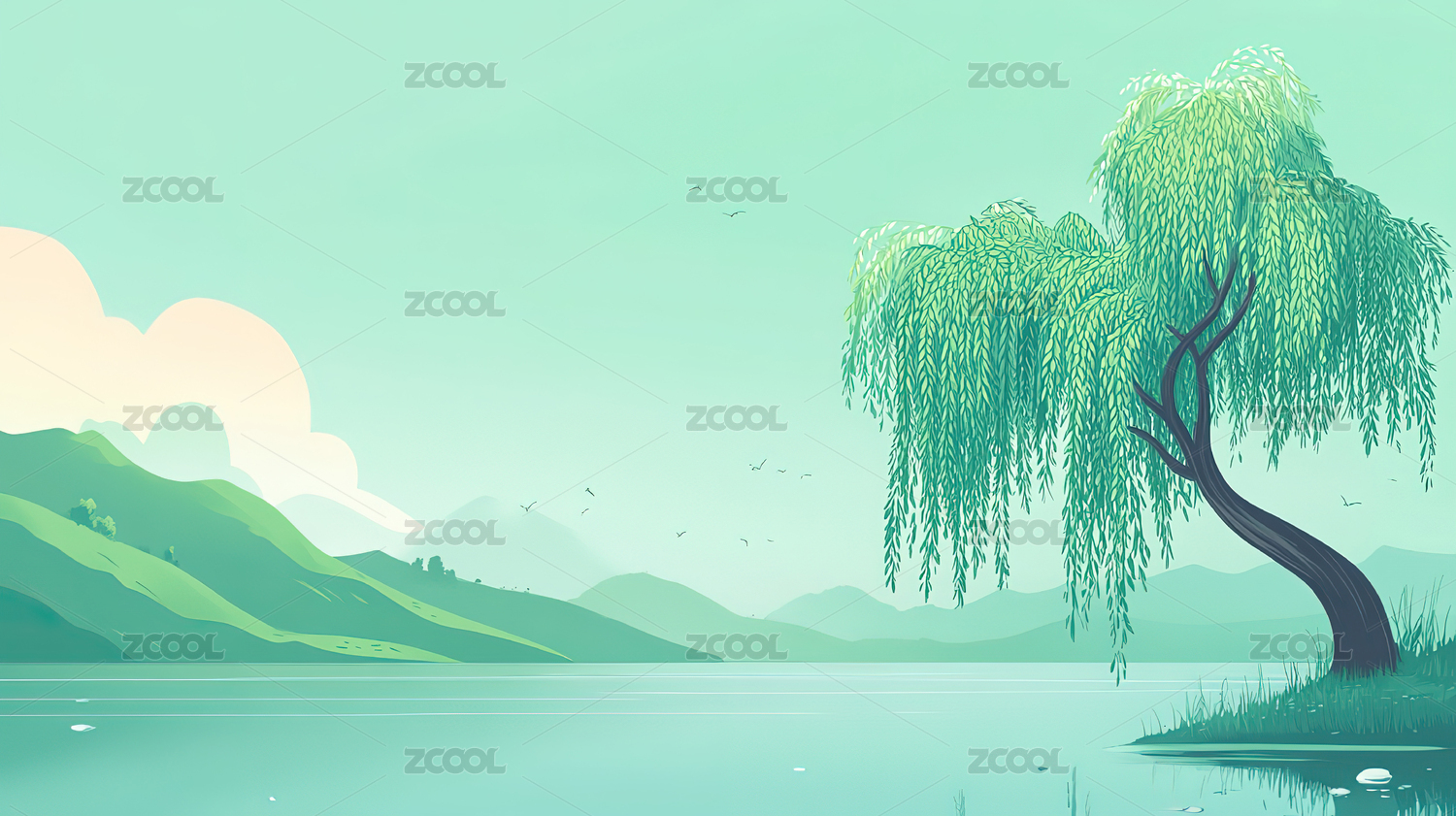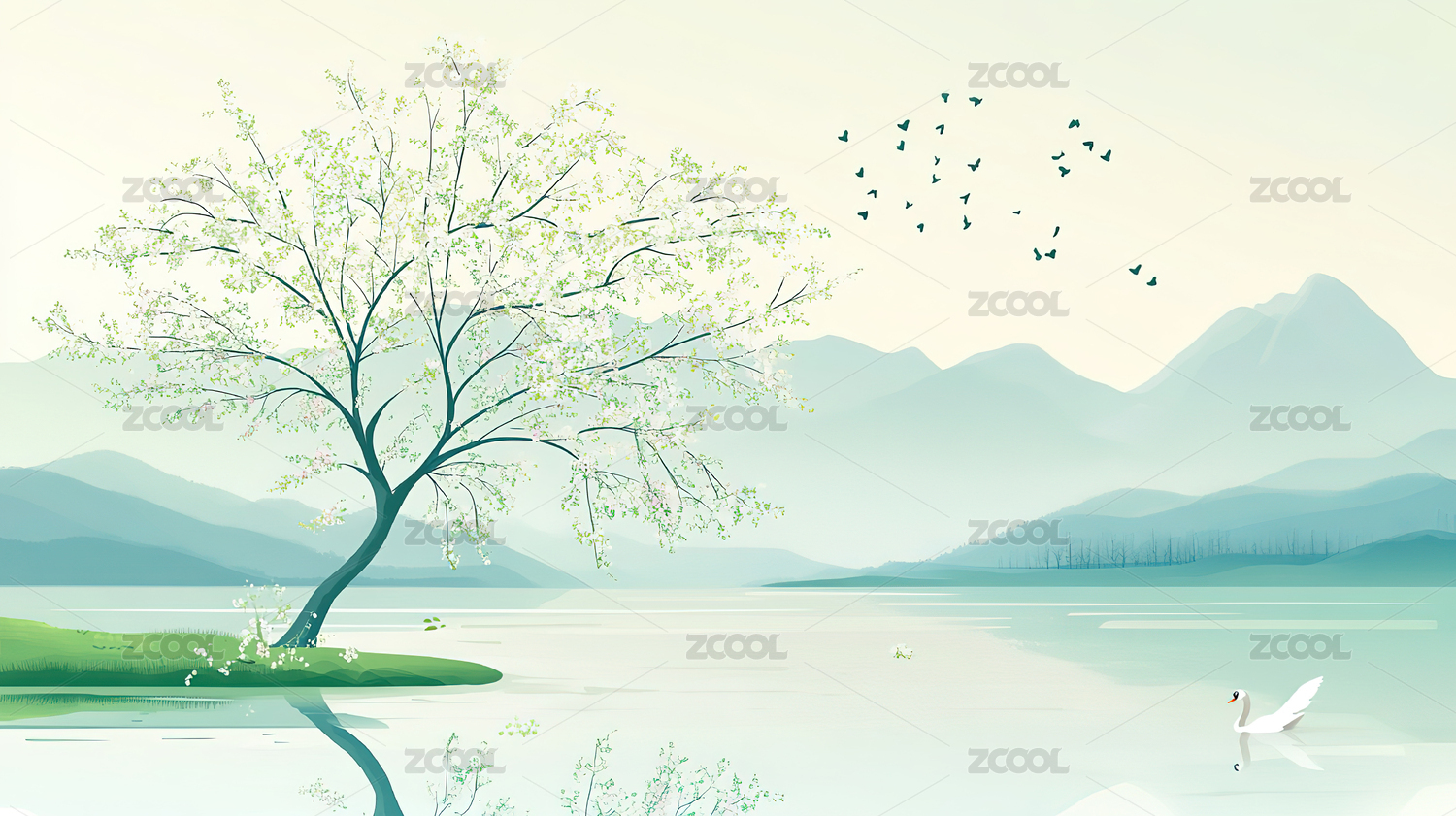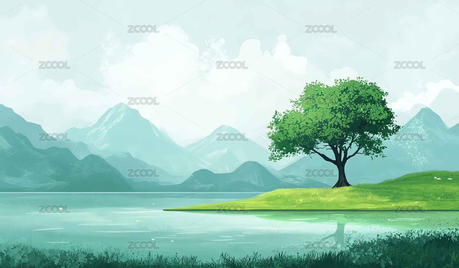 蓝天白云绿色草地湖泊卡通动漫背景插画壁纸