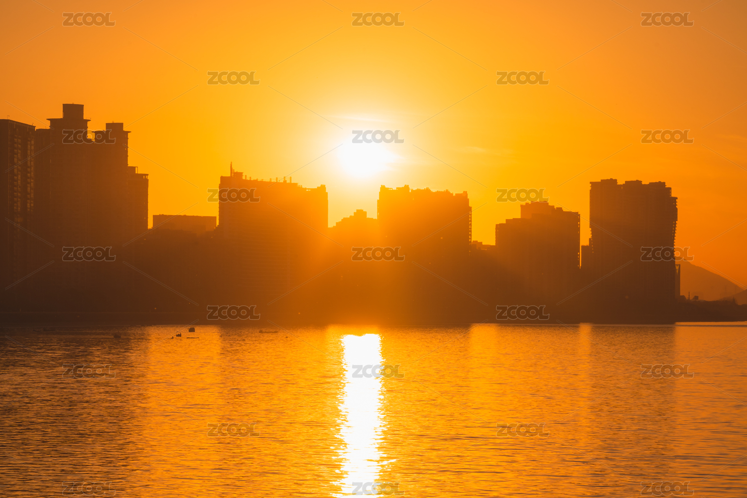 落日黄昏日柱天象下的杭州之江版块城市建筑