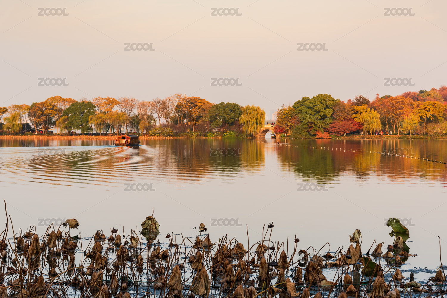 中国浙江杭州西湖景区,西湖残荷与苏堤秋景