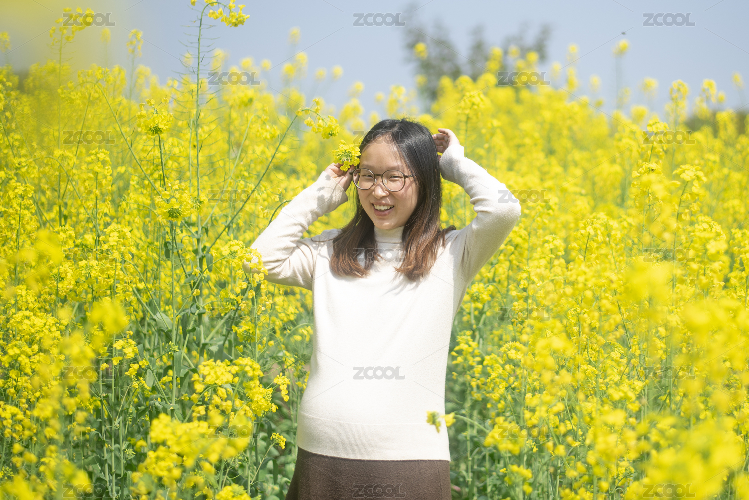 油菜花田中的年轻女人