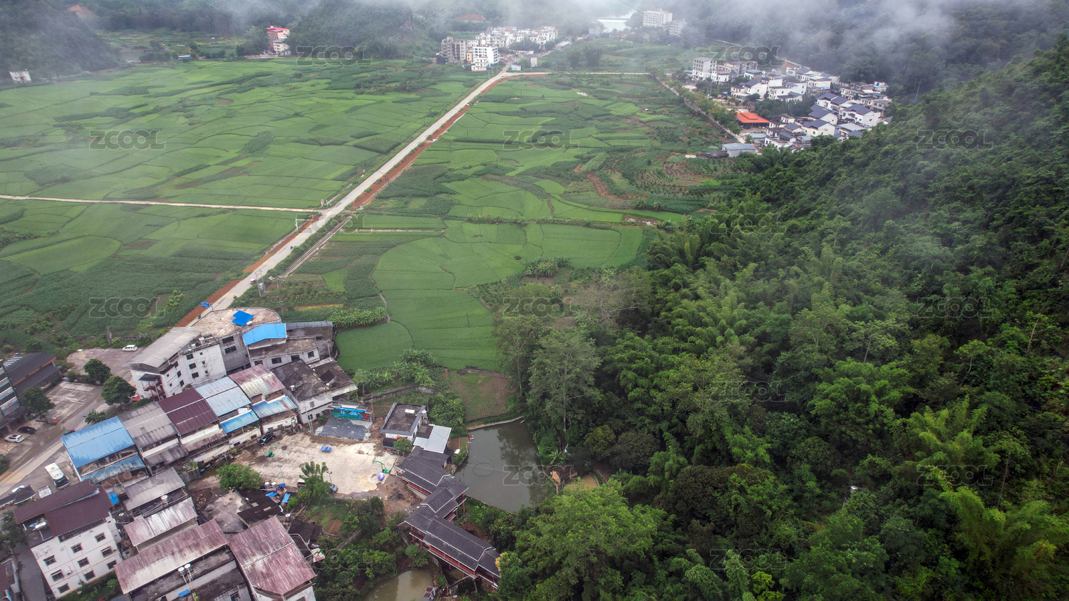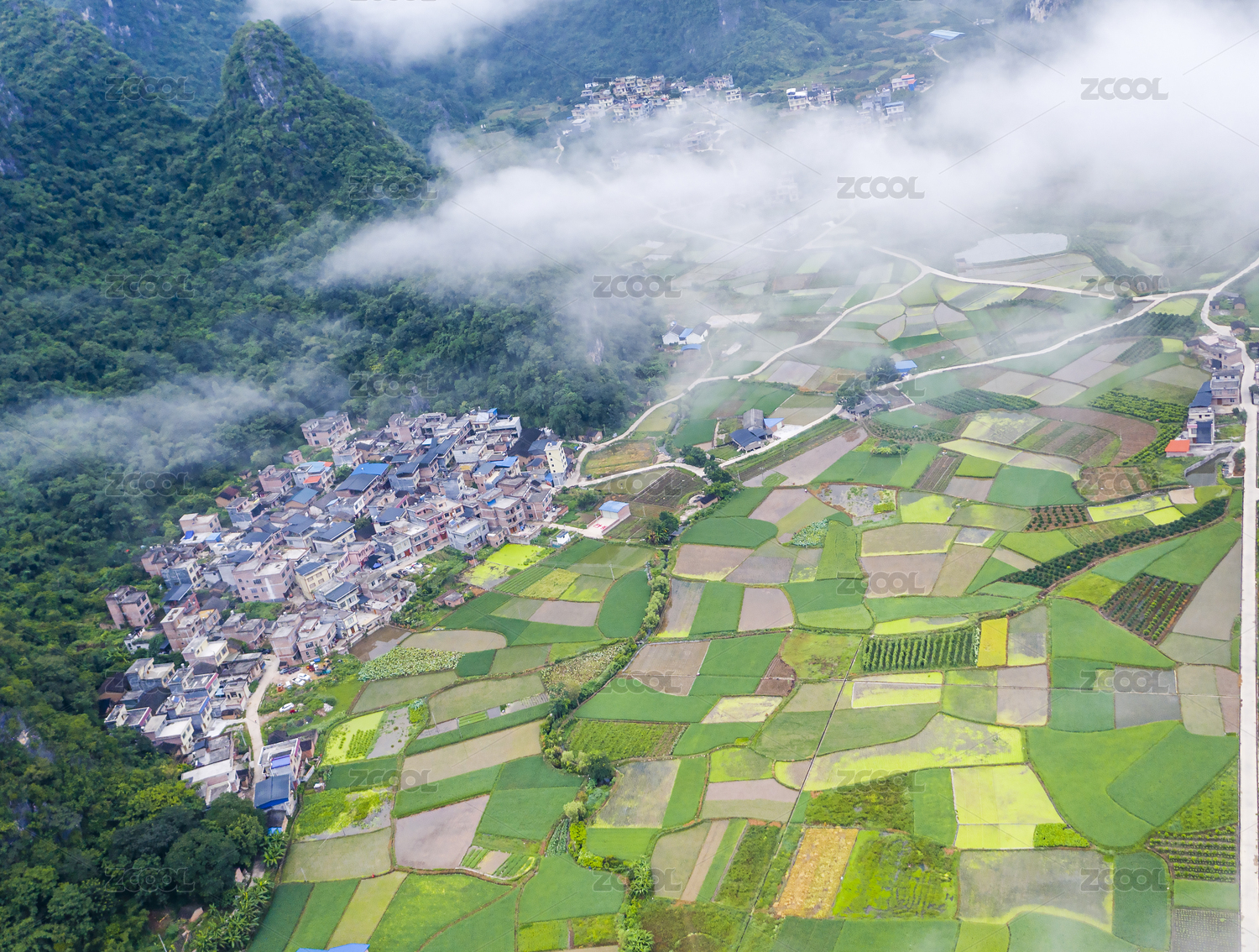 航拍广西夏季晨雾中的绿色黄色的红岩口村
