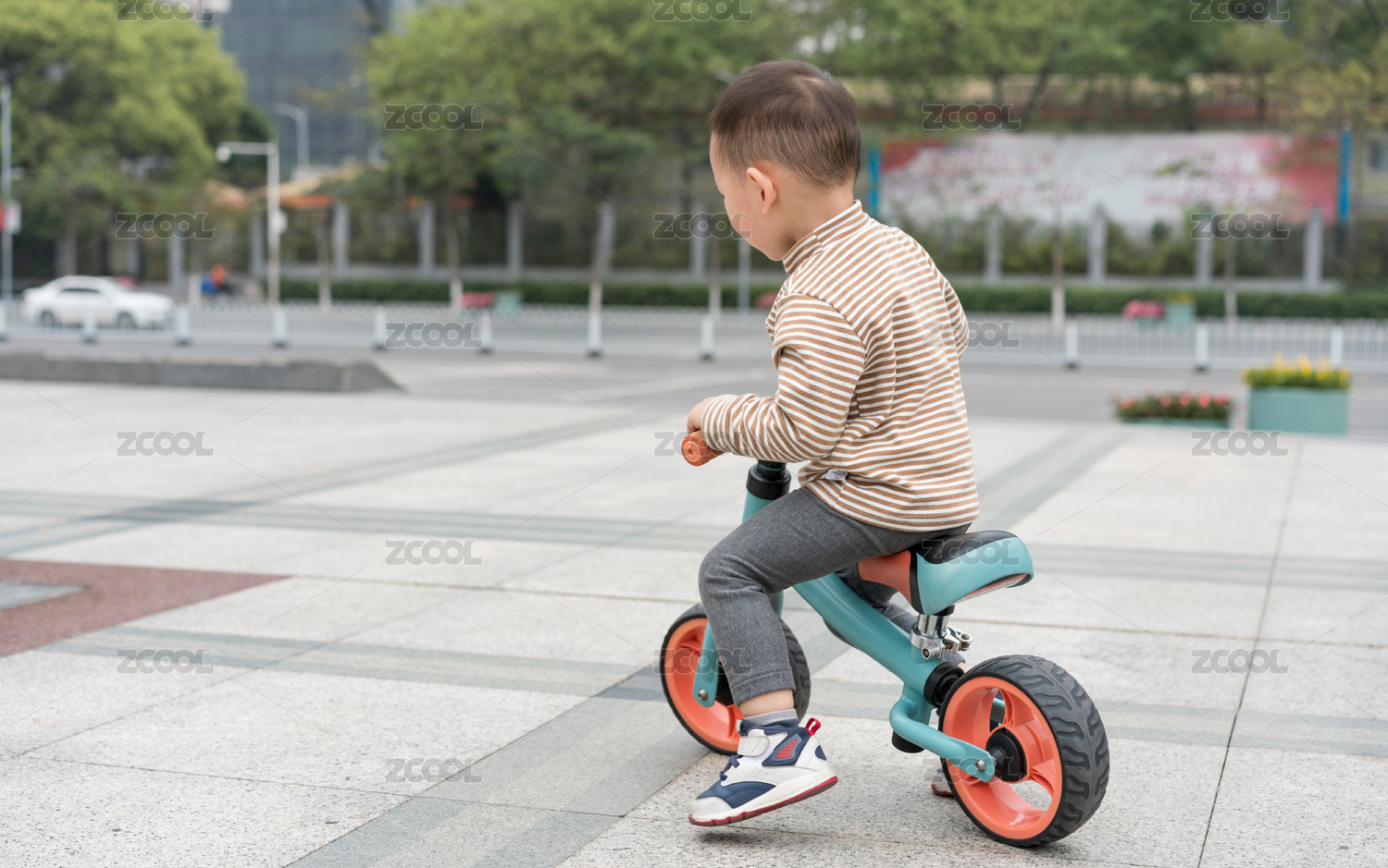 城市小道上骑三轮童车男孩