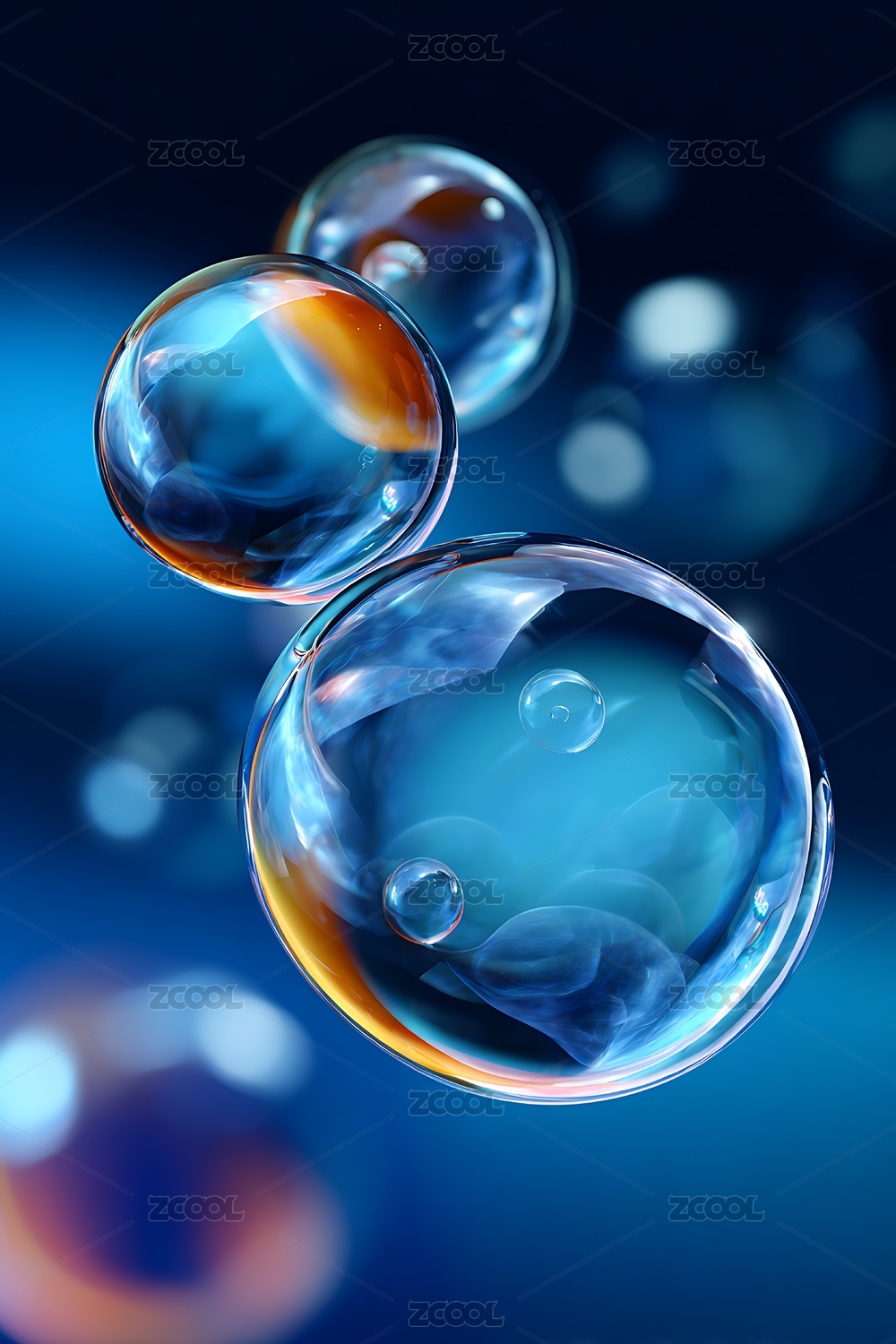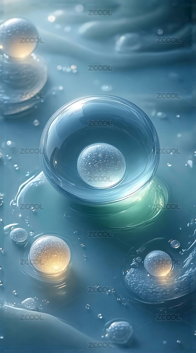 蓝色背景中悬浮的透明气泡