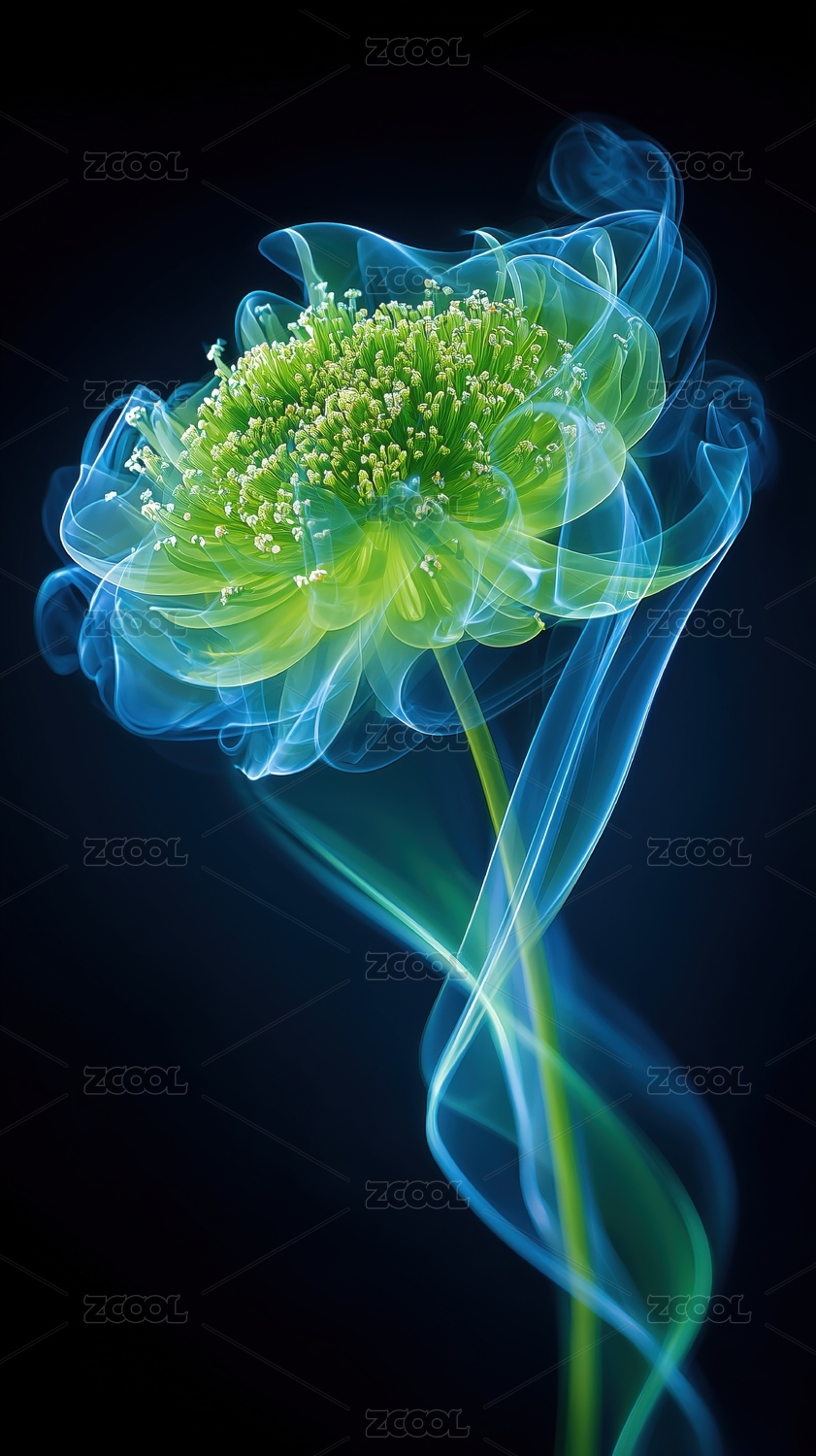 黑背景烟雾流动的全息透明绿色3D立体花朵