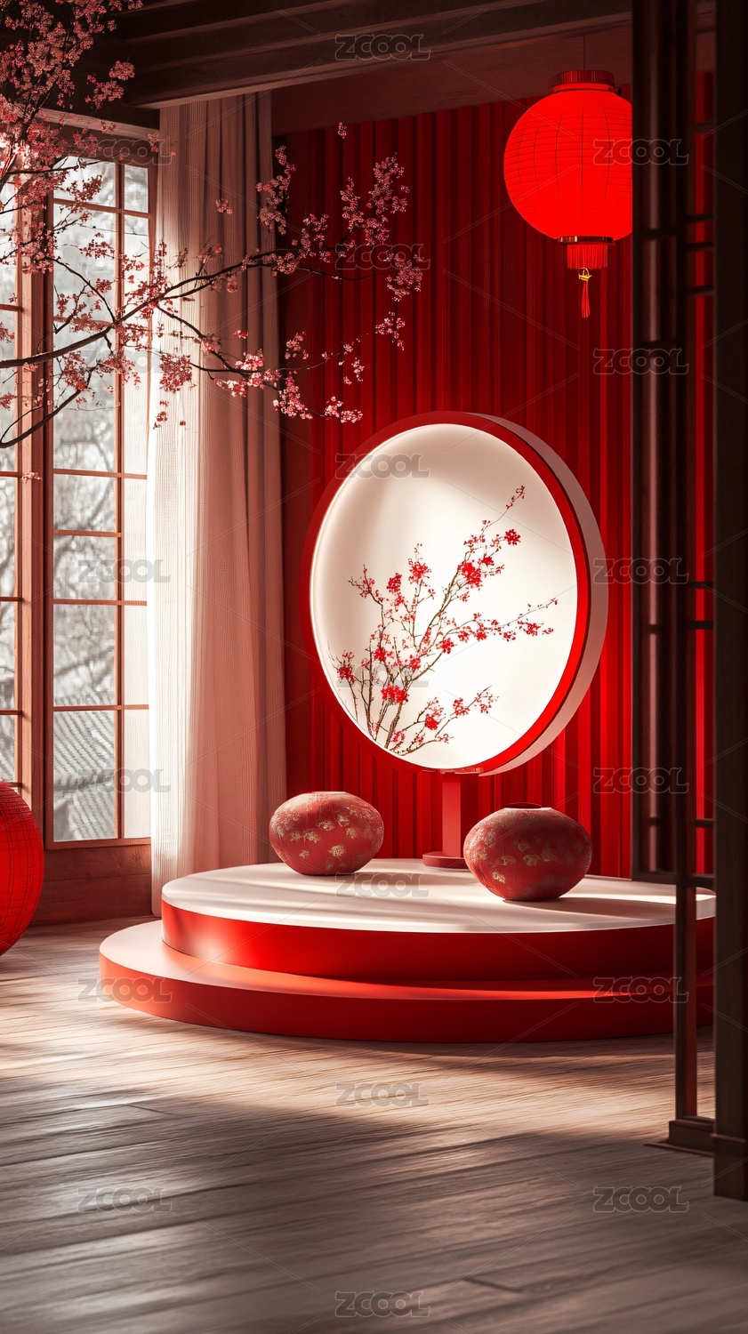 春节新年元宵节中秋节节日红色背景展示台