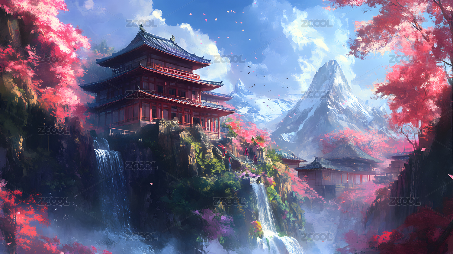 山峰,天空,宁静,古风,城镇,树木,唯美,梦幻,阁楼