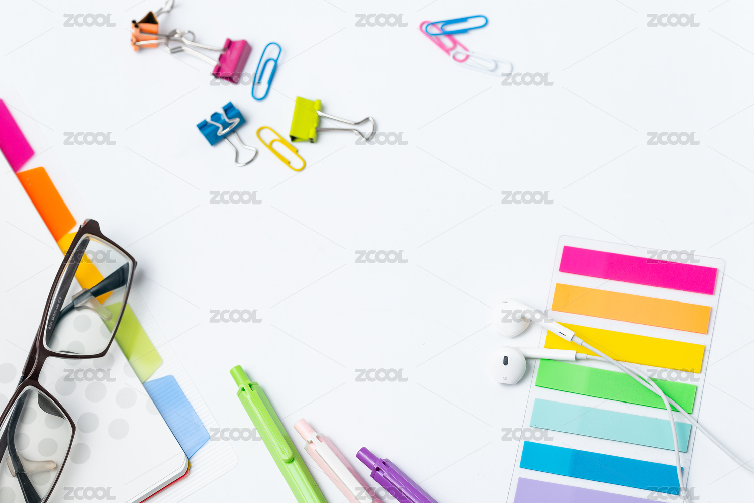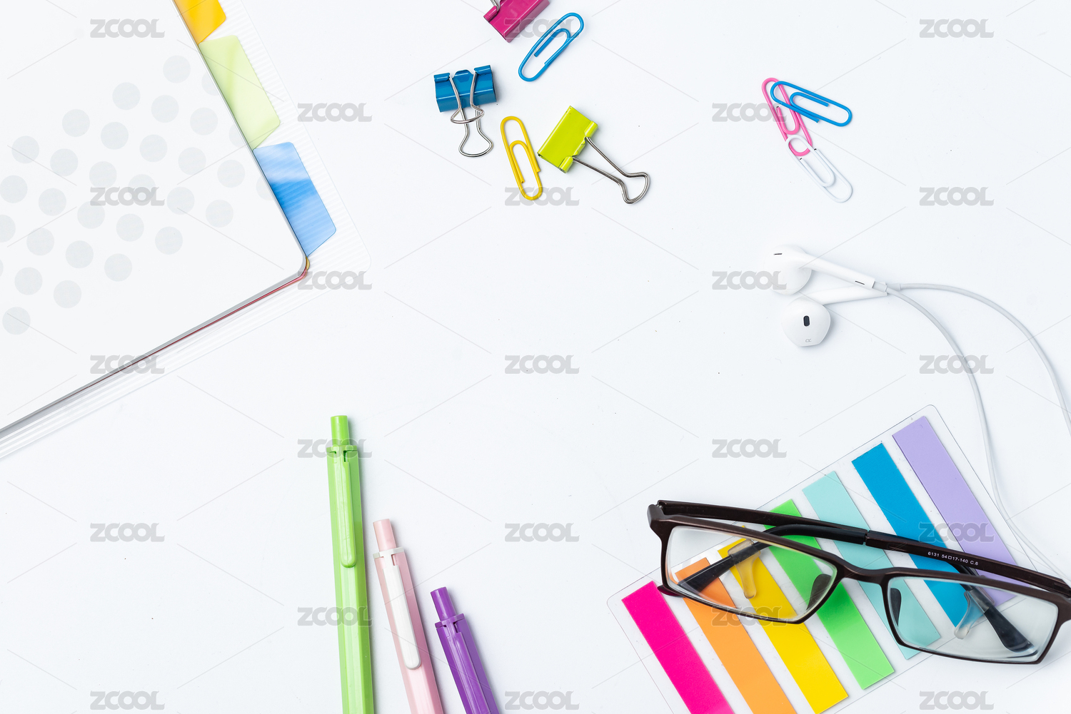 白底办公桌上摆放的彩笔、笔记本眼镜等文具