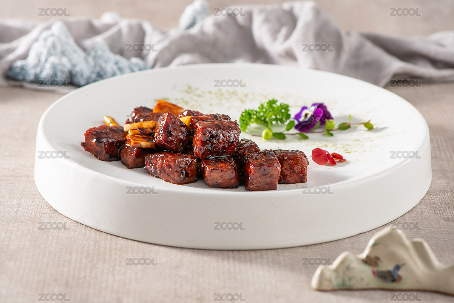 白色瓷盘装的的家常酱炖牛肉
