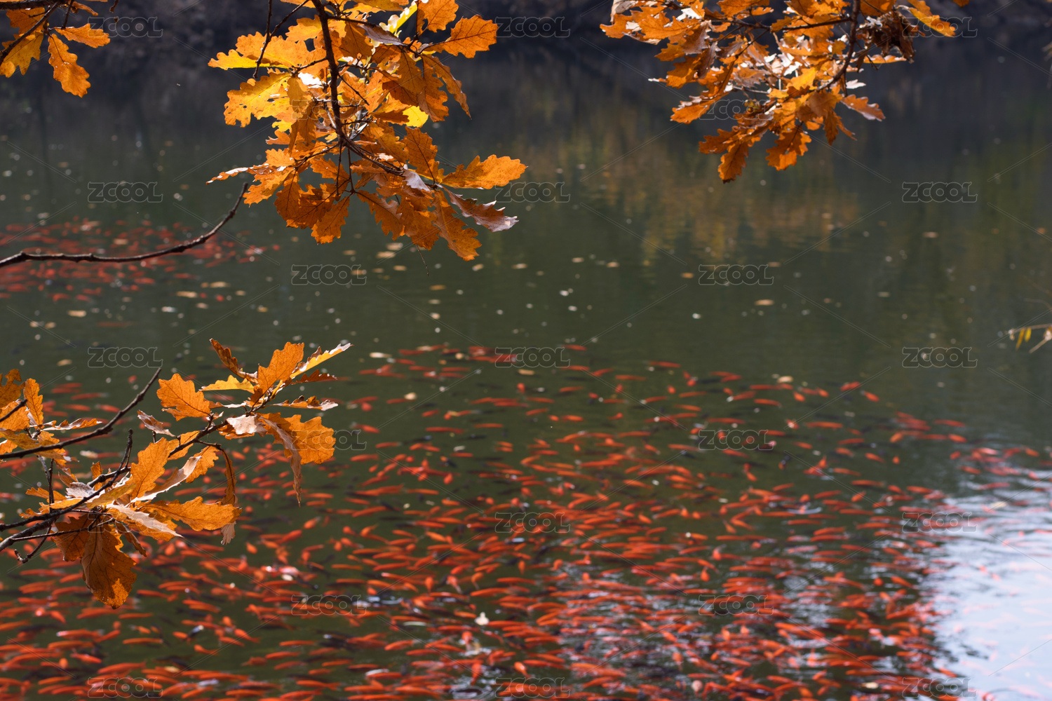辽宁千山风景区秋季黄叶和水里的锦鲤
