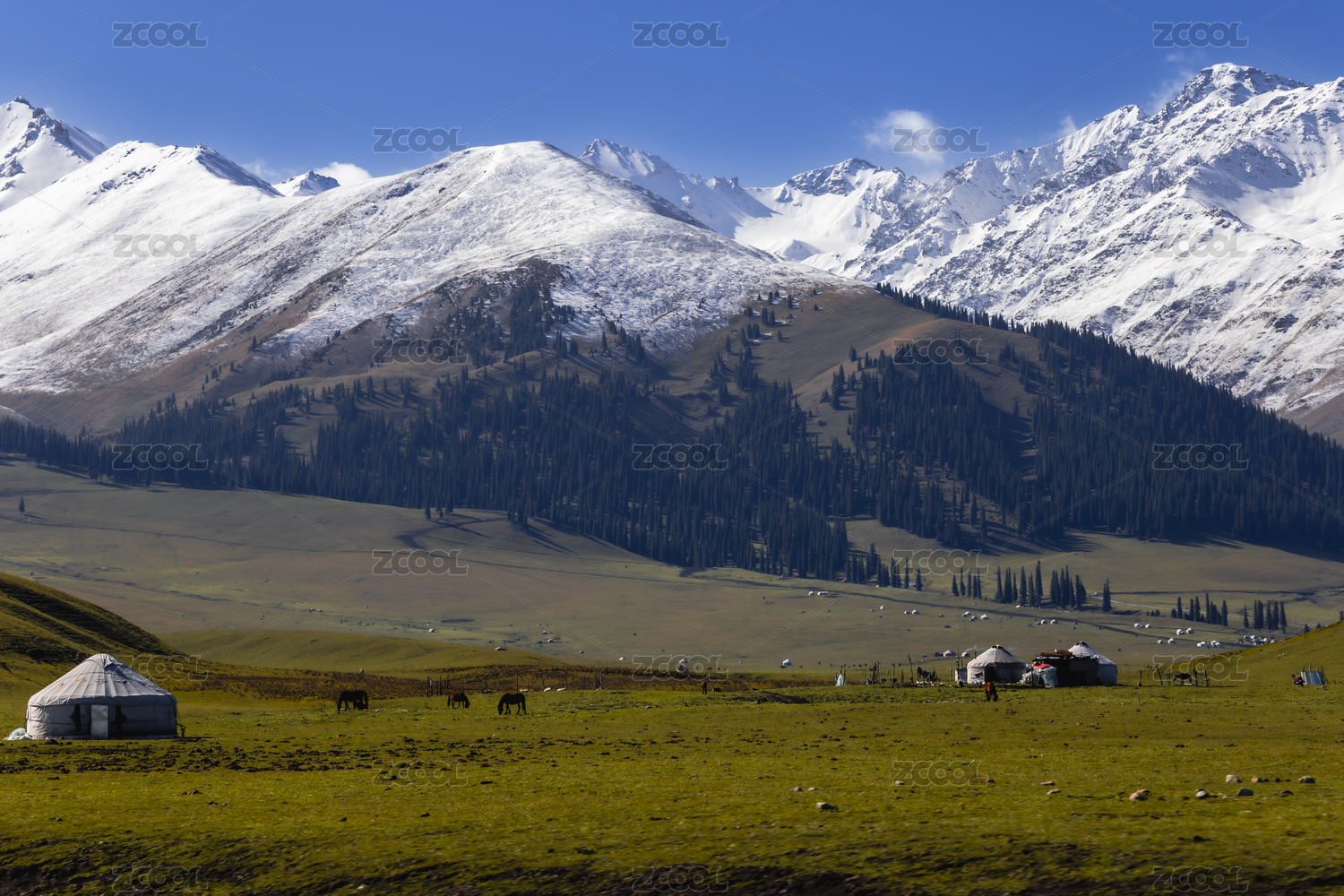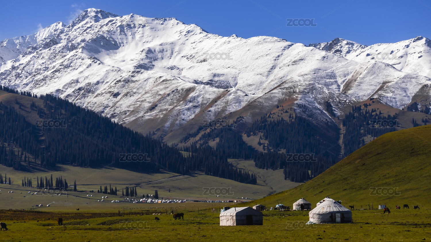 中国新疆伊犁那拉提的雪山草地森林与牧场