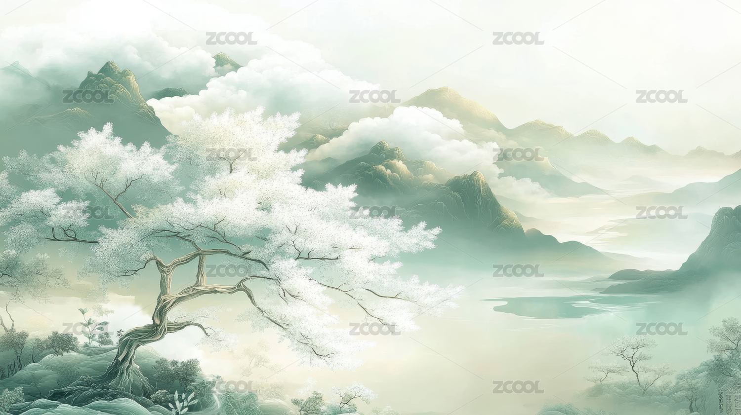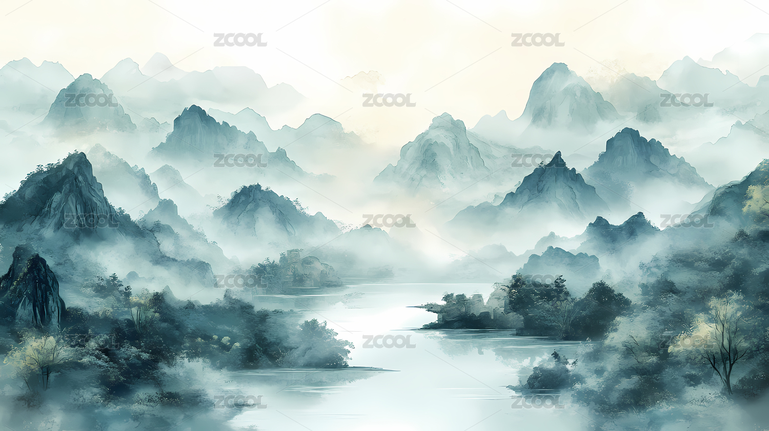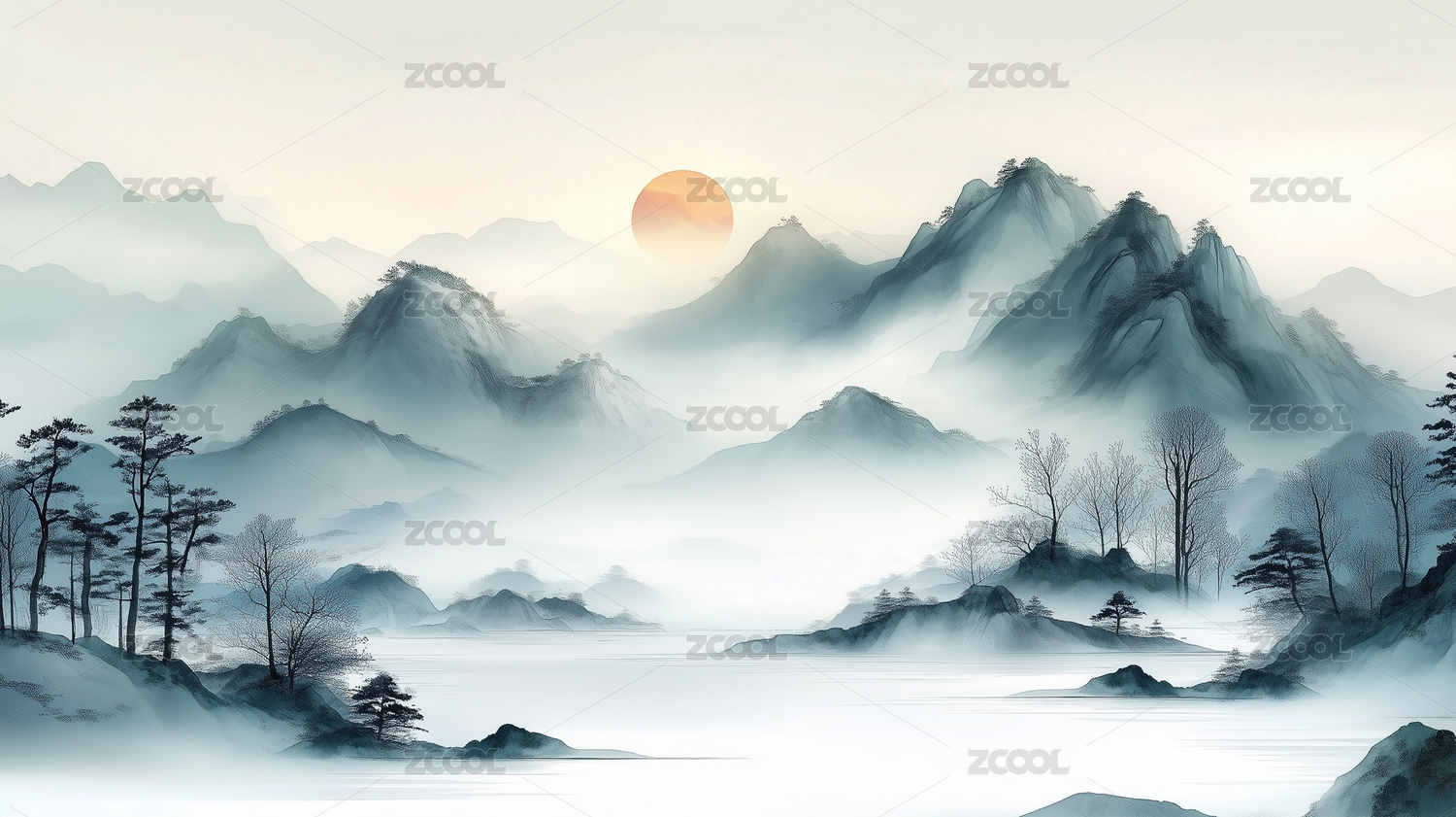 清新,淡雅,山峦,水墨画,树木,山水画,中国画,传统,宁静,江南