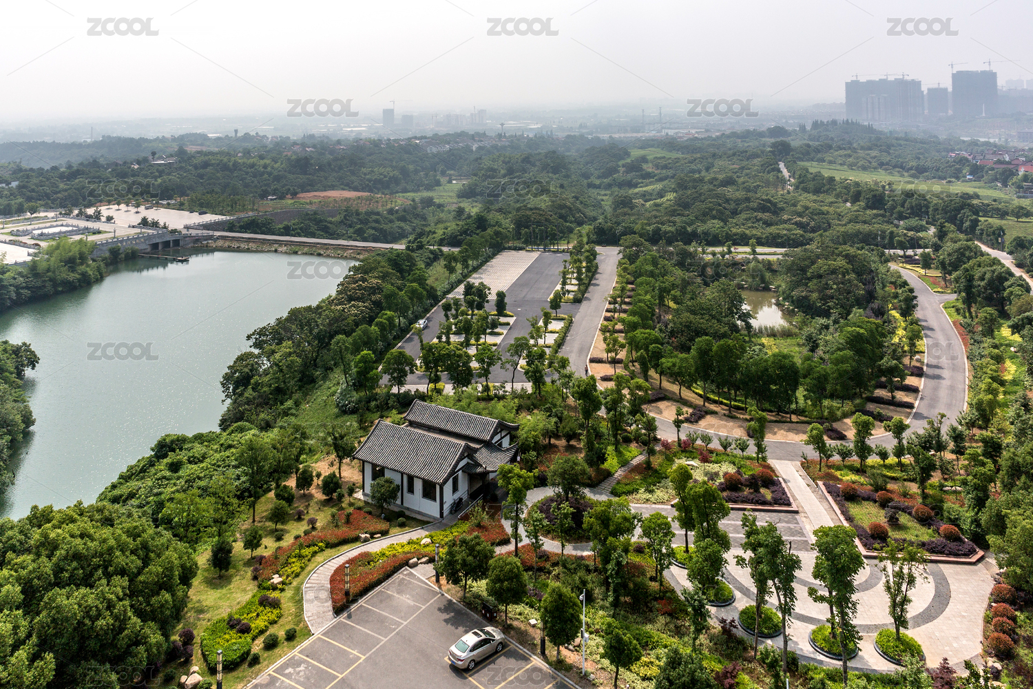 航拍江苏省镇江市句容市图书馆与崇明公园