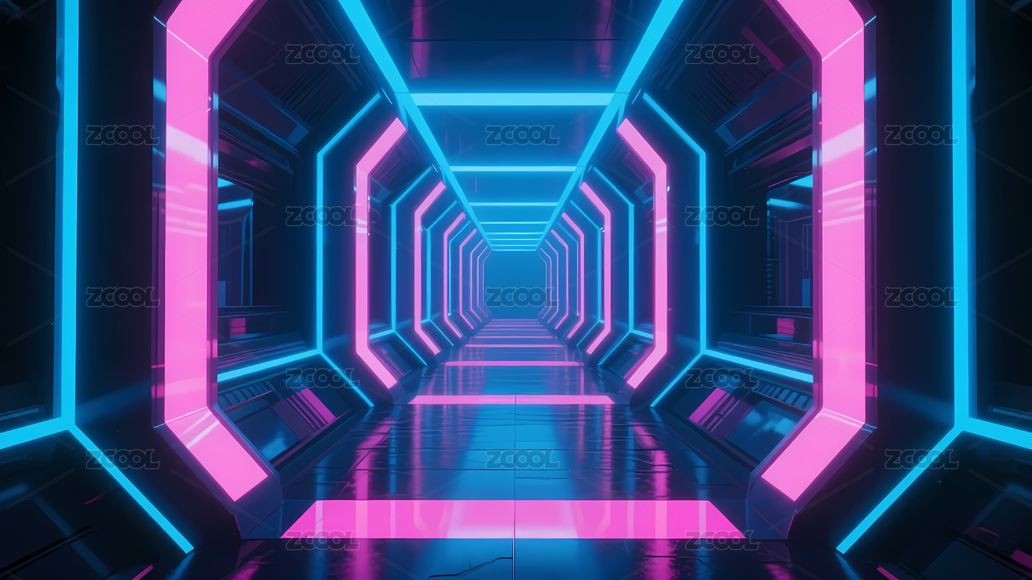 3D渲染科幻几何隧道霓虹灯线概念插图