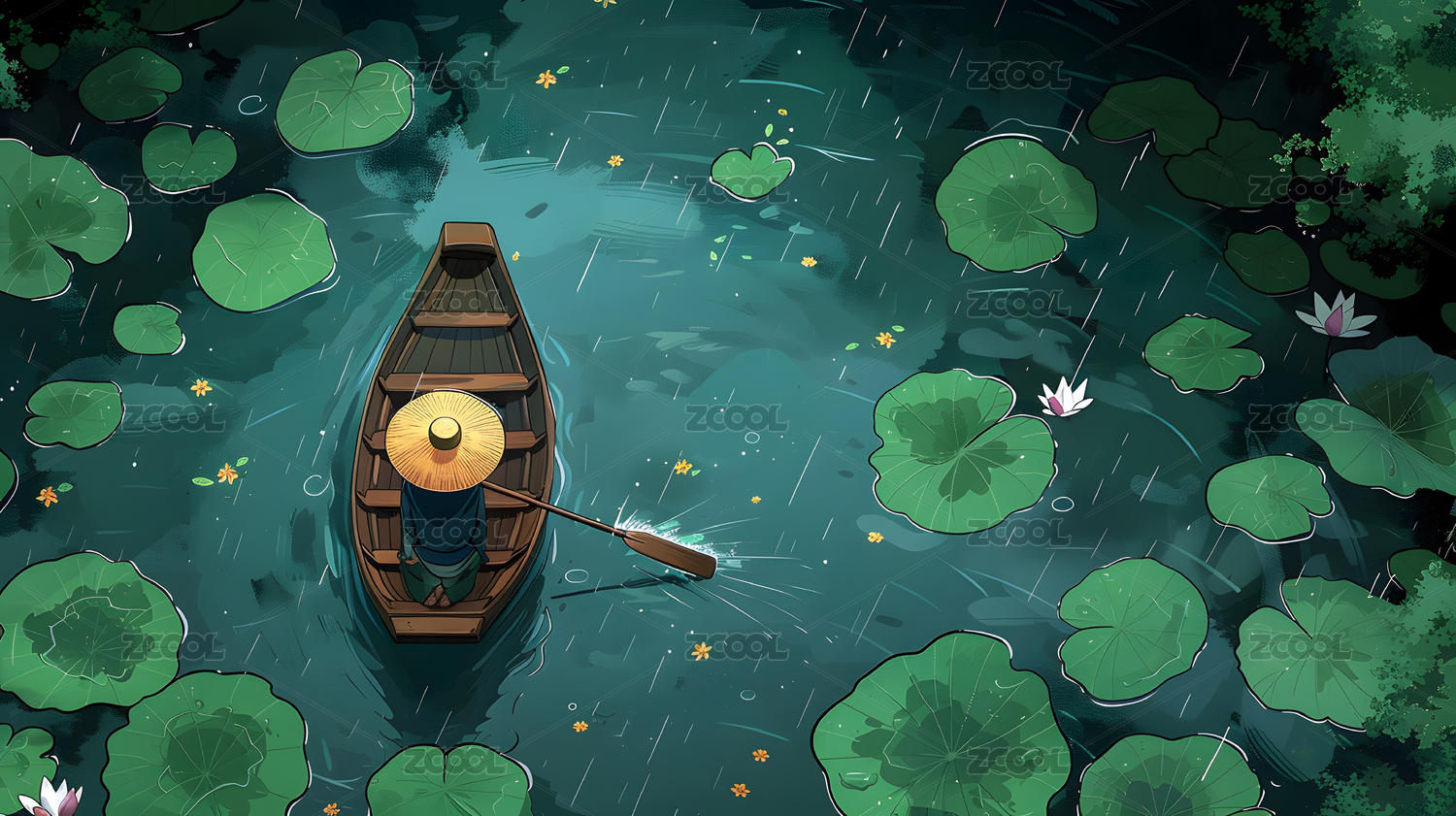 下雨荷塘中小船卡通插画