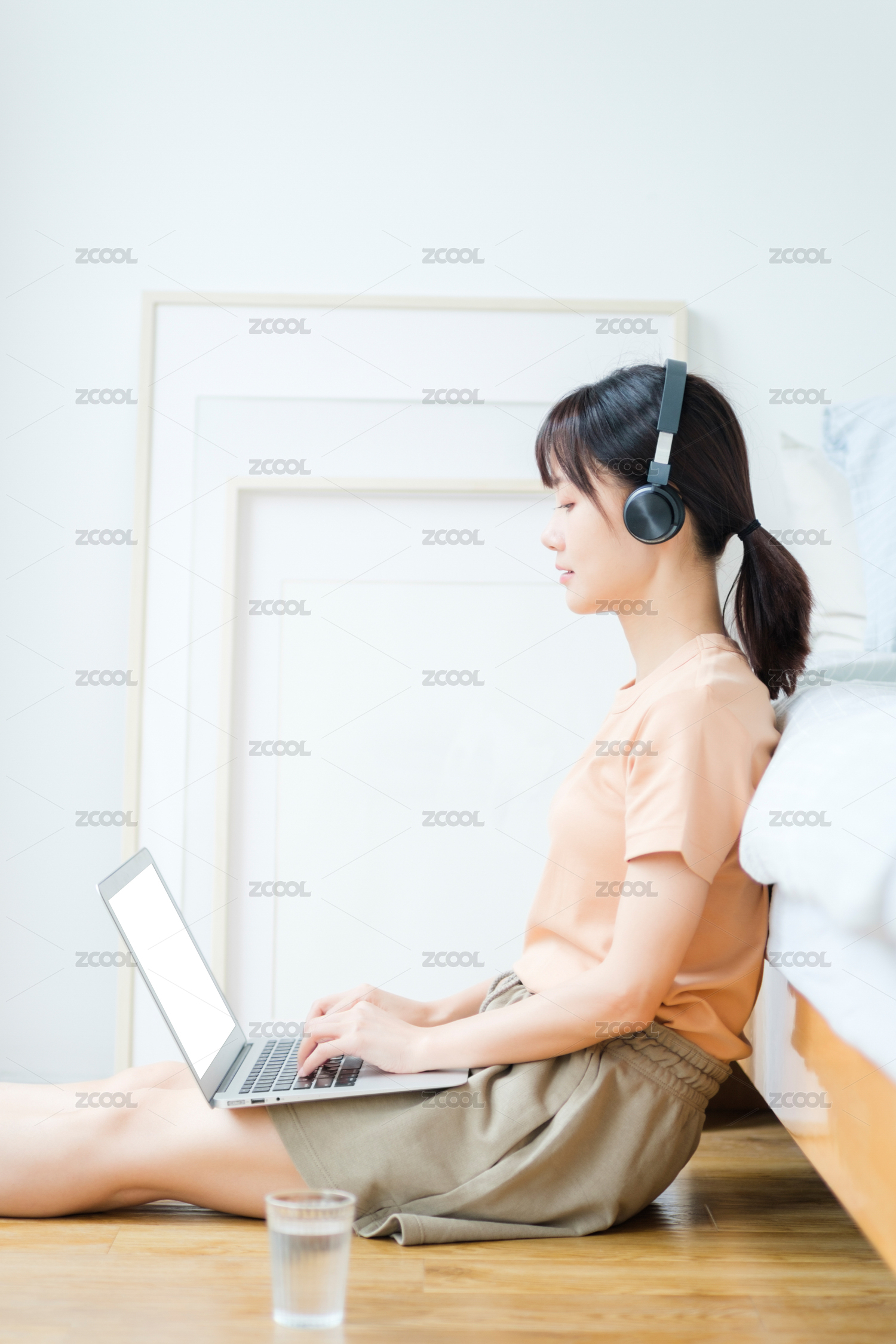 坐在床上一边使用电脑一边听音乐的中国女孩