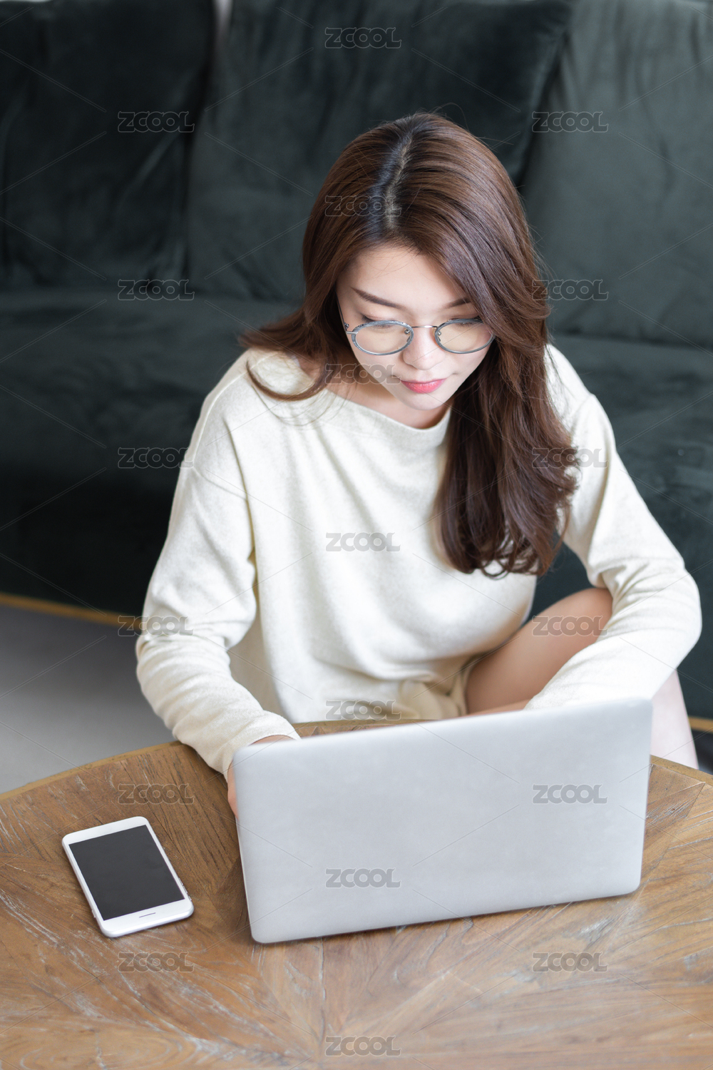 一名年轻的亚洲女子在坐在客厅使用电脑