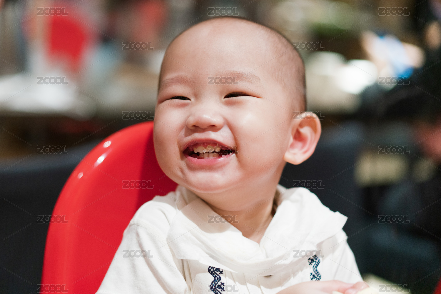 餐厅里坐在儿童餐椅里的男婴儿