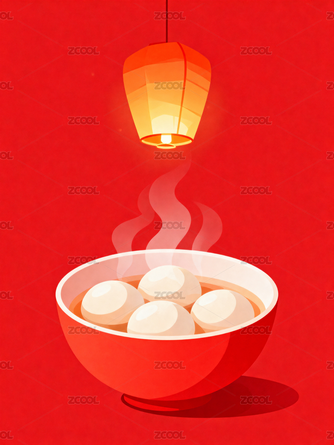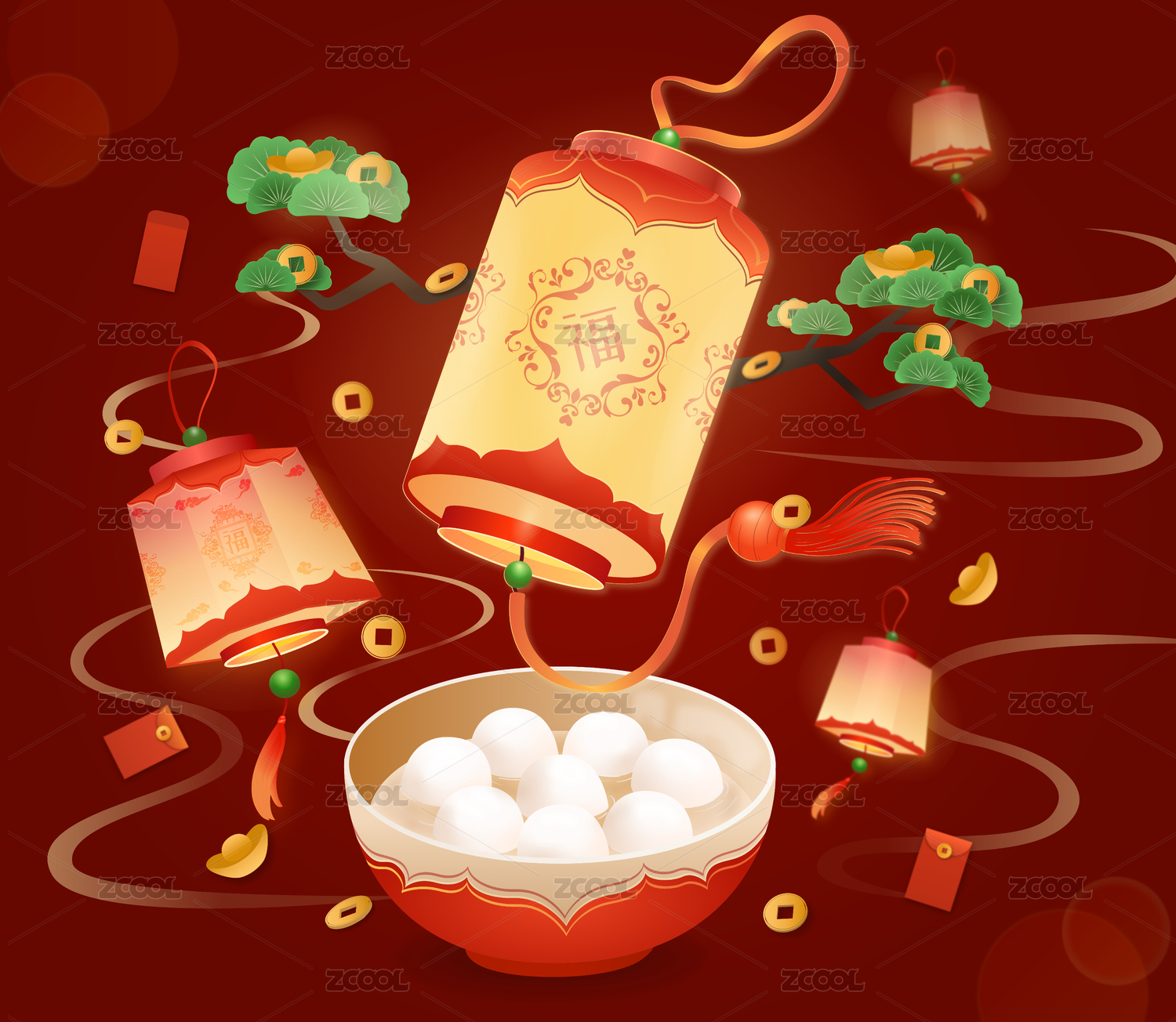 元宵节灯会一大碗汤圆和一些元宝红包的素材