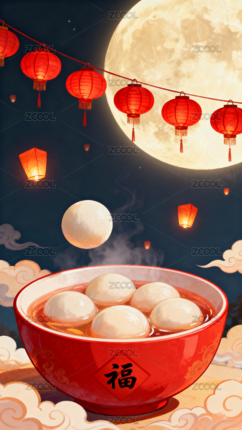 元宵佳节一碗汤圆和灯笼猜灯谜等国潮风插画