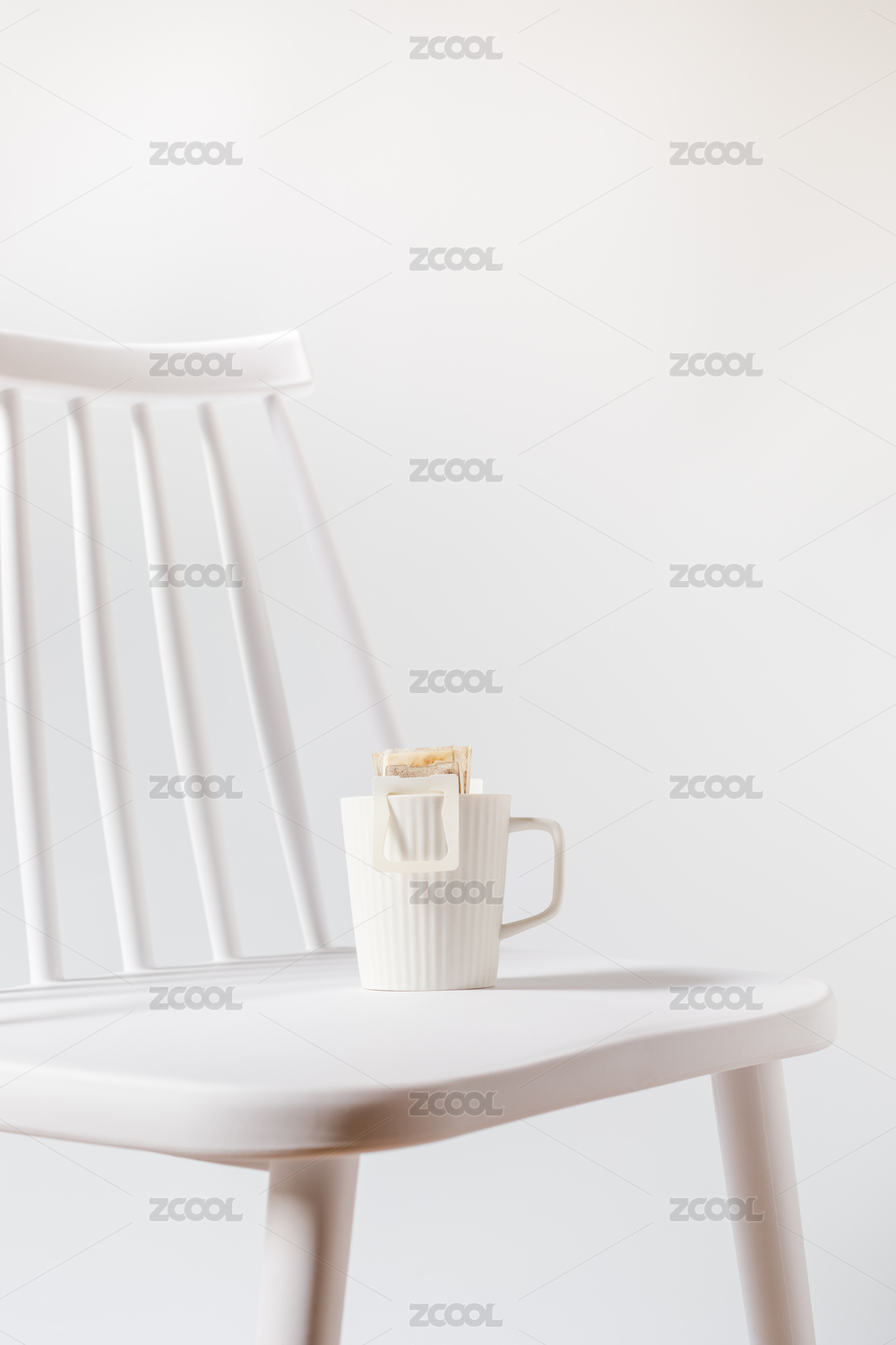 北欧白椅子上放在白色马克杯里的挂耳咖啡