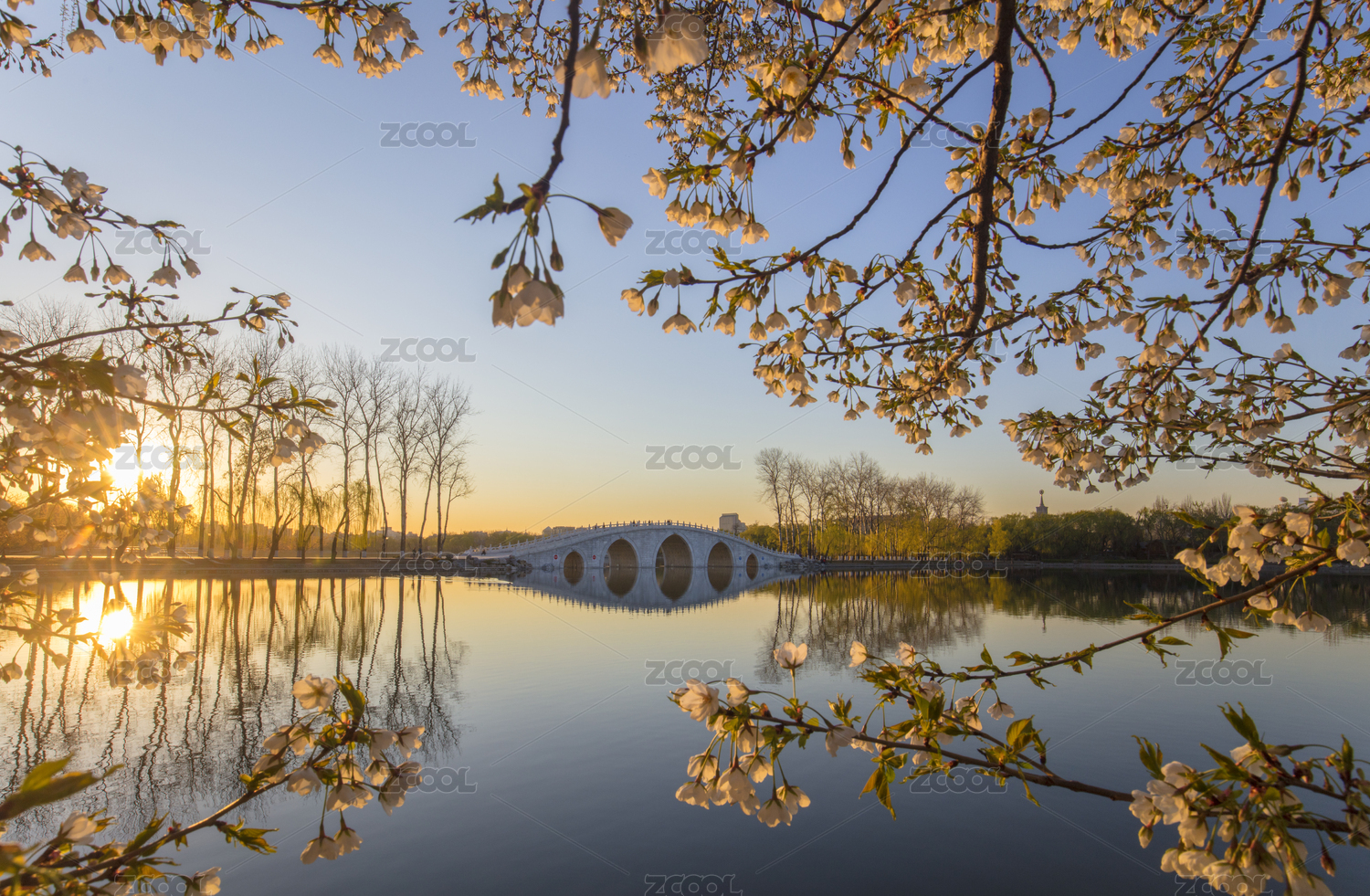 北京春天玉渊潭公园樱花掩映下的五孔桥