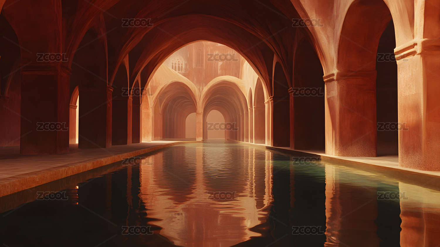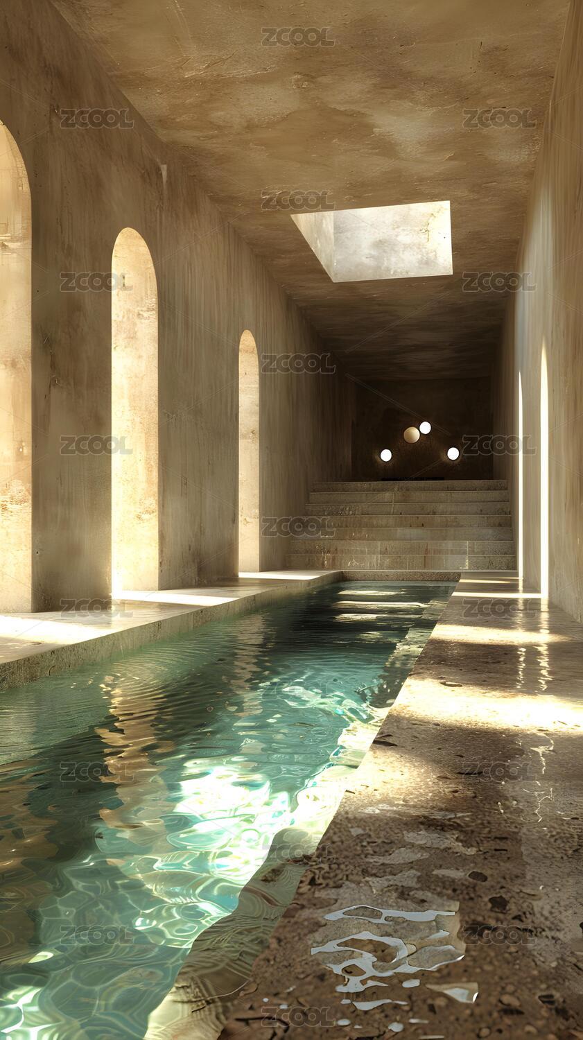 室内泳池拱形建筑红棕色调