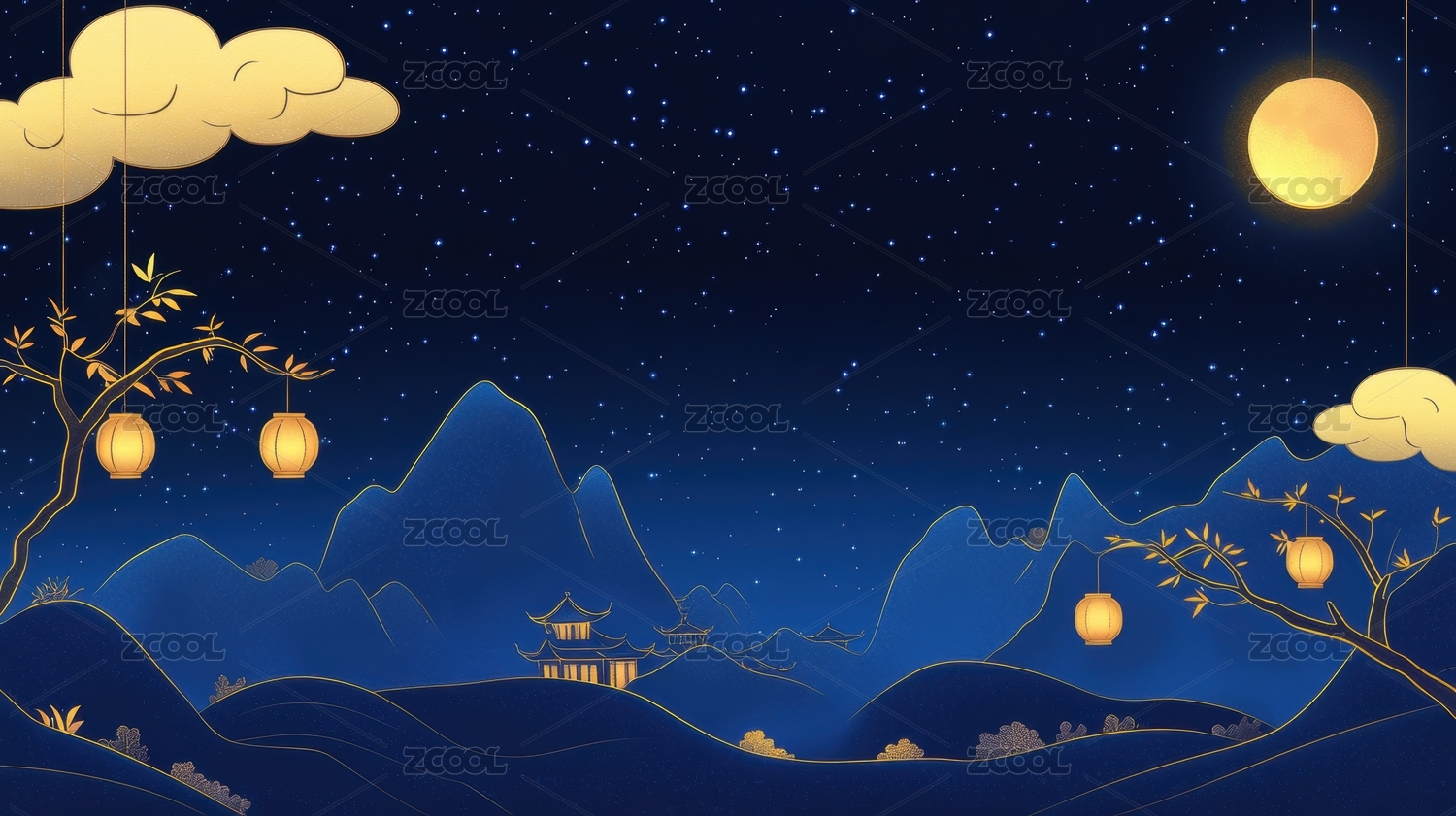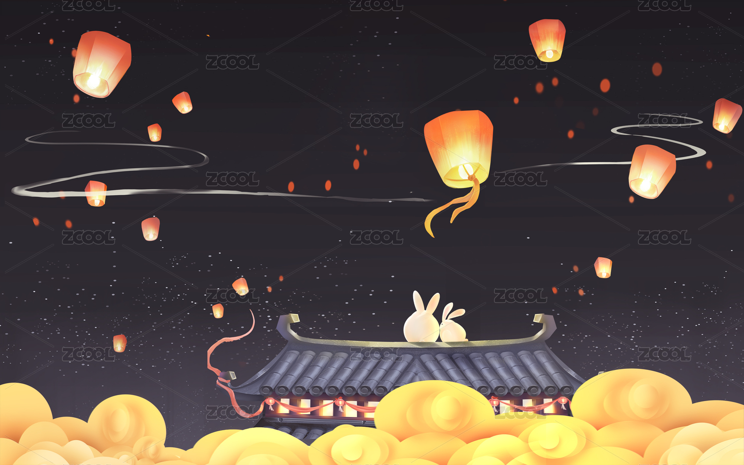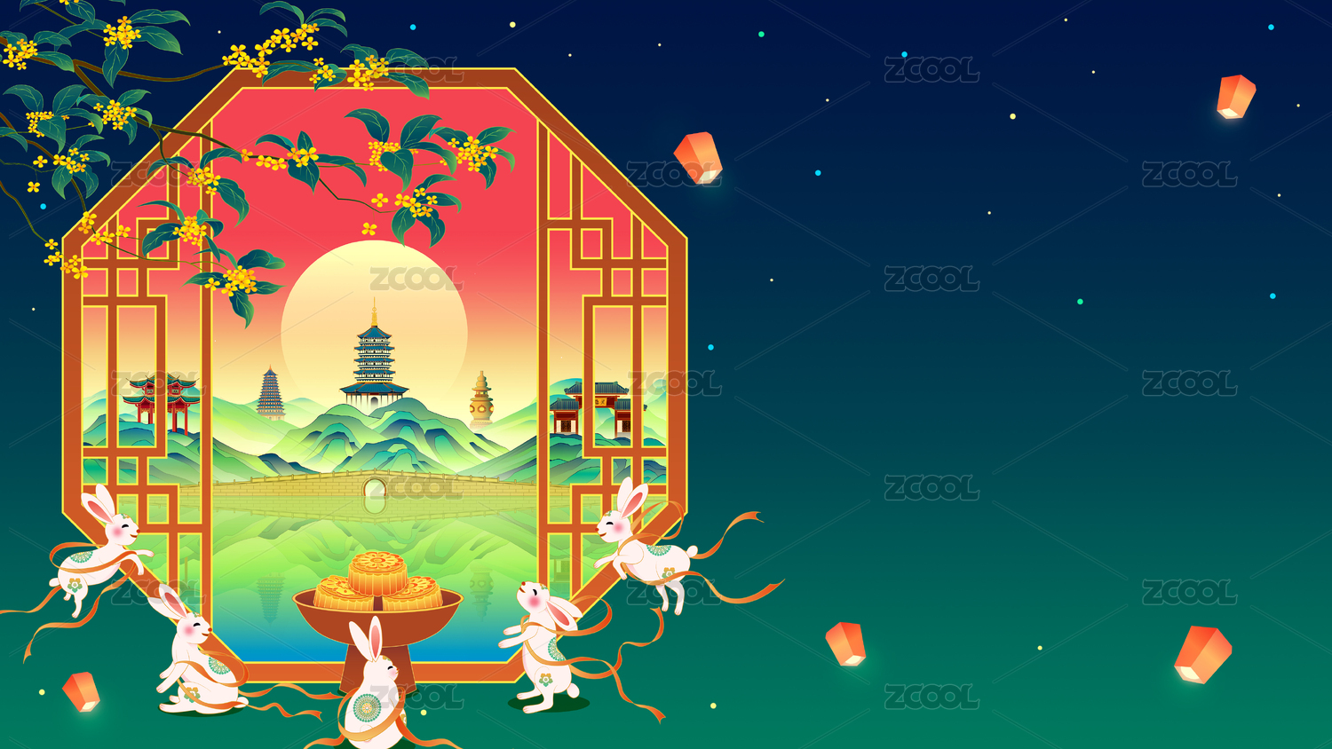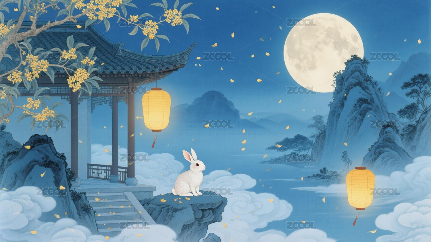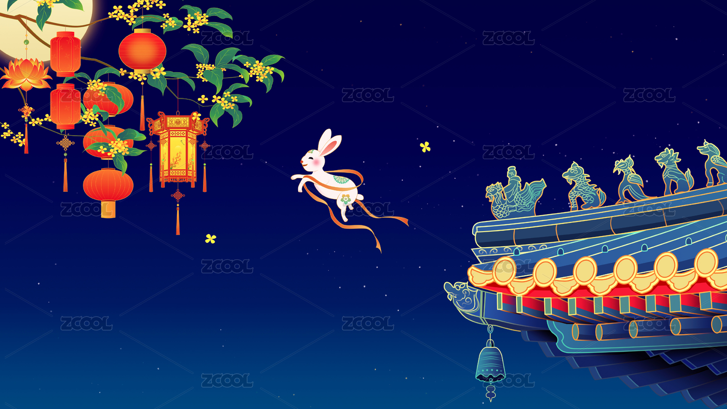 中秋节故宫玉兔飞天灯笼桂花中国风插画