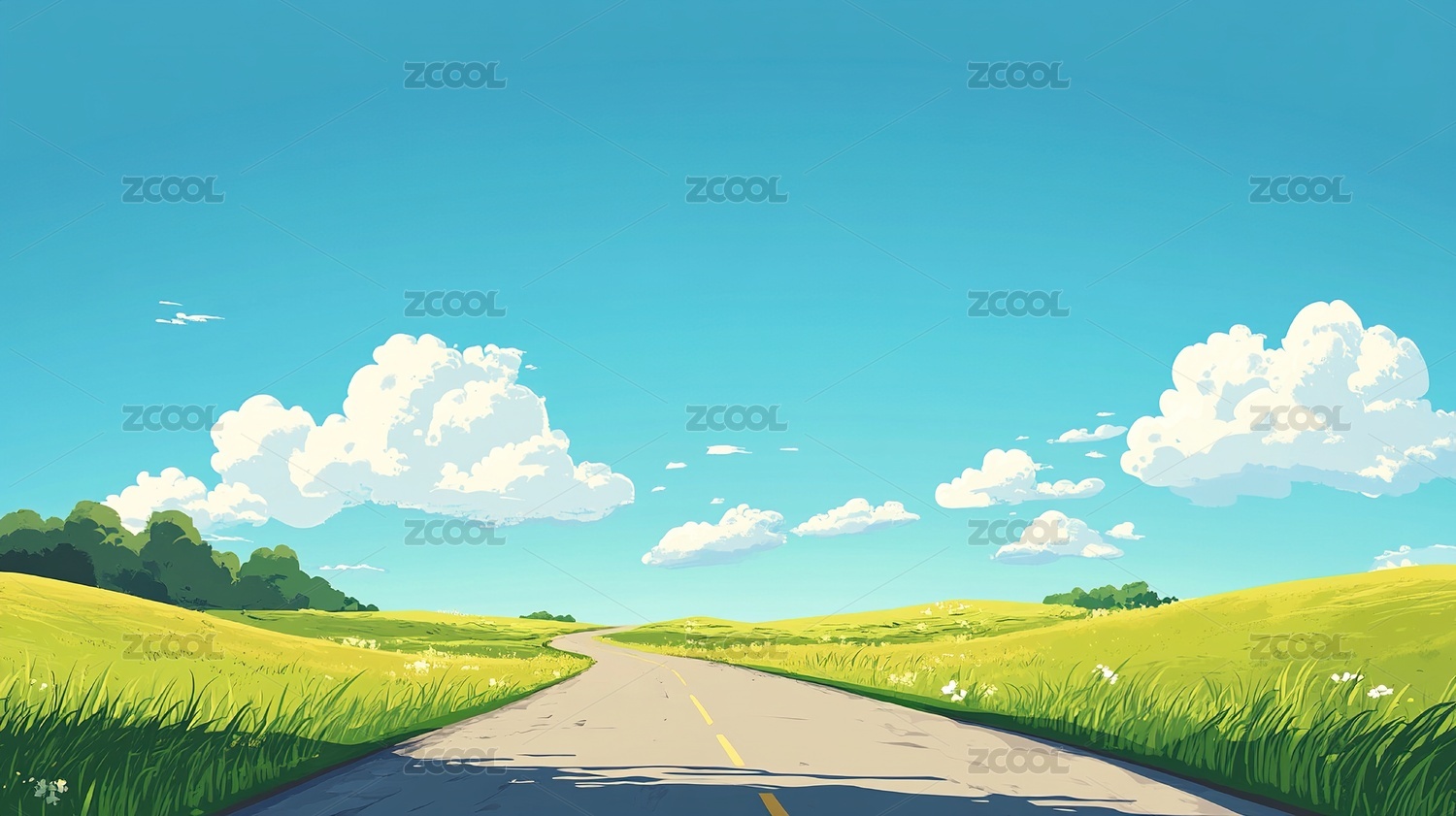 蓝天,白云,动漫,草丛,马路,天空,清新,户外,自然,旅游